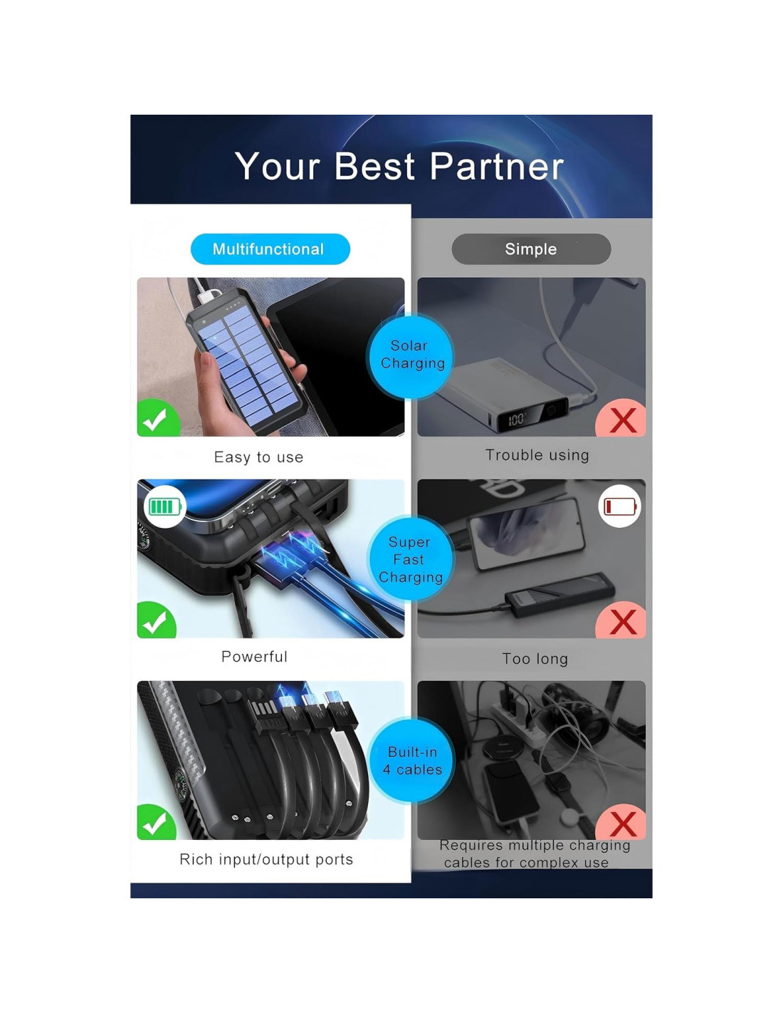 - [4 cables integrados, máxima comodidad] Este cargador portátil viene con 4 cables integrados (Micro USB, Lightning, Tipo-C y USB-A), no es necesario llevar cables adicionales, perfecto para viajar y uso al aire libre, conveniente y rápido.