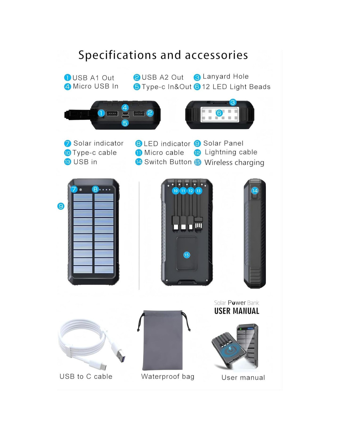 - [Compatible con Múltiples Dispositivos] El banco de energía solar está equipado con 4 puertos (entrada Micro, salida USB A1/A2, entrada/salida USB C), proporcionando carga de alta velocidad de 4.5V*5A/5V*3A/9V*2A/12V*1.5A para ahorrar tiempo. Junto con 4 cables de carga y carga inalámbrica, admite la carga de 7 dispositivos simultáneamente. Su cable Tipo-C integrado es compatible con la serie Apple 15/16, y la velocidad de carga puede alcanzar Carga Rápida PD20w. Puedes usar este Banco de Energía para resolver el 98% de los problemas de carga de productos digitales en el mercado. Incluso puede admitir la carga de dispositivos VENTILADORES dentro de 12V.