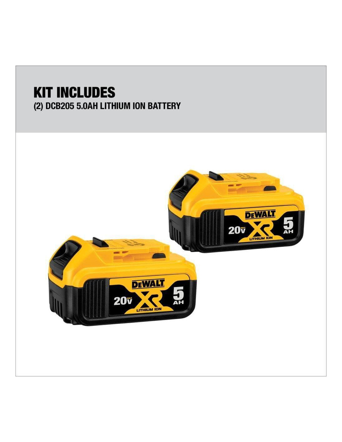 El kit de inicio DEWALT DCB205-2CK 20V max 5.0Ah cuenta con (2) baterías XR 20V max 5.0Ah, proporcionando hasta 10 horas de amperaje de capacidad. El cargador DCB115 es capaz de cargar todas las baterías de 12V, 20V y 60V max a una carga de 4 amperios. Este kit de inicio incluye una bolsa suave para almacenamiento adicional de herramientas. Las baterías vienen con una garantía de servicio gratuito de 3 años. El kit de inicio incluye: (2) baterías DCB205 5.0Ah, (1) cargador DCB115, bolsa suave.