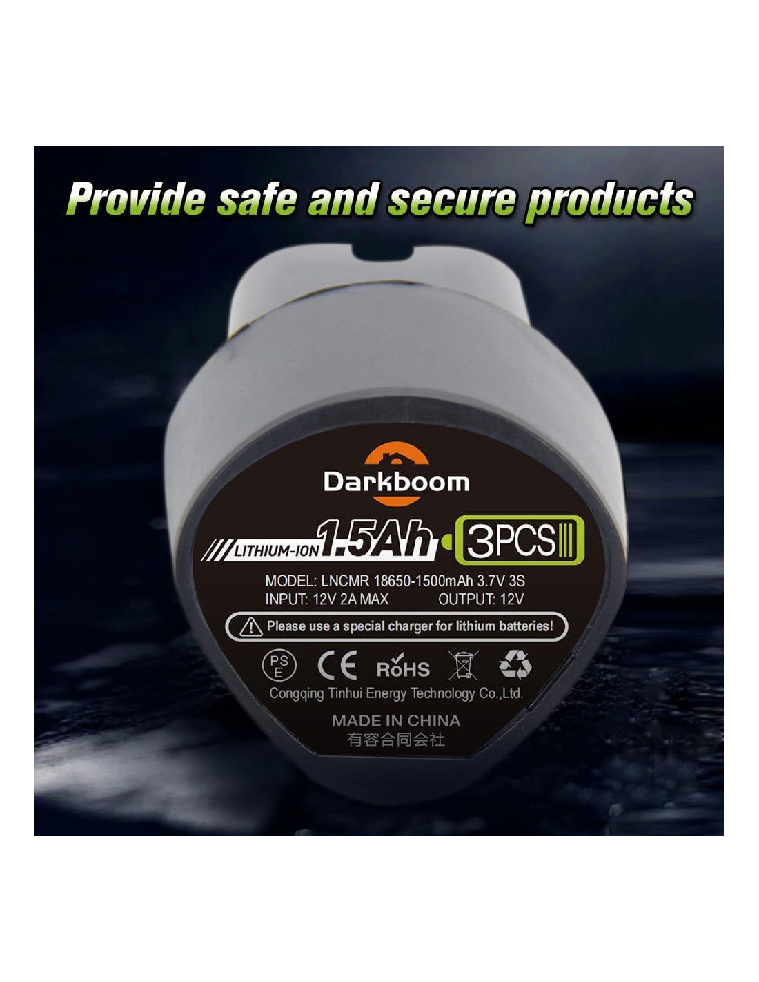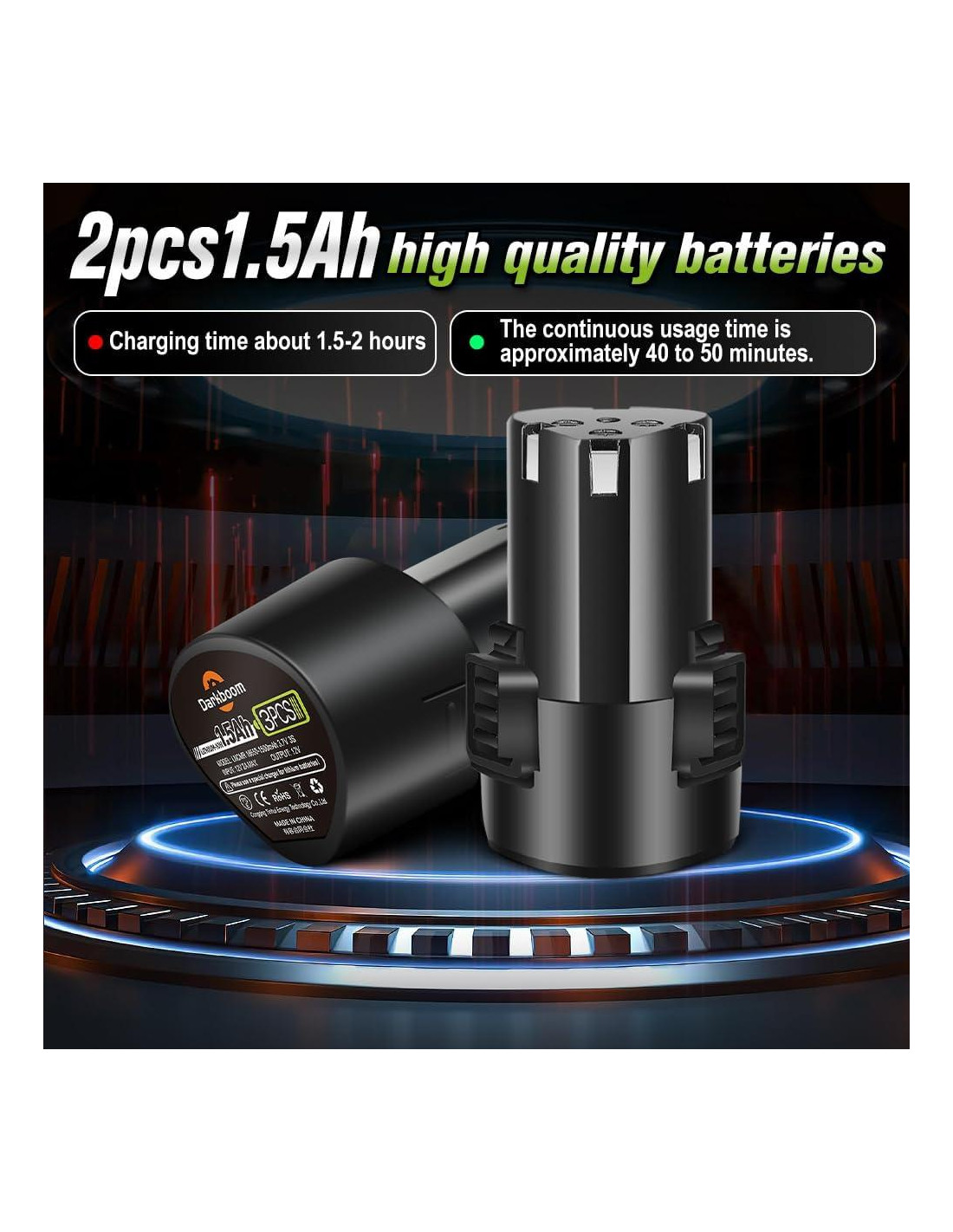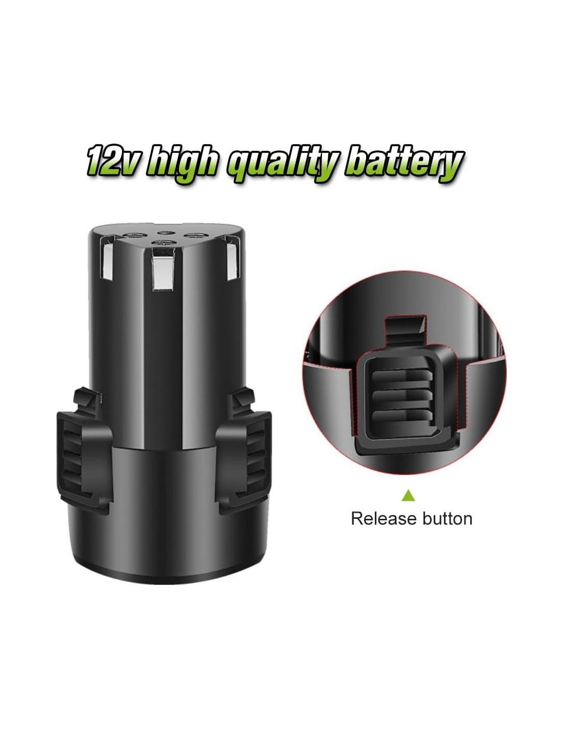 - Combinación de producto: 2 baterías | Voltaje: 12V | Capacidad de la batería: 1.5ah, 1 cargador de batería, 1 manual en inglés. Este paquete de baterías es compatible con más del 90% de las herramientas eléctricas de 12V. Por favor, compare la apariencia del producto o consulte al servicio al cliente antes de comprar.