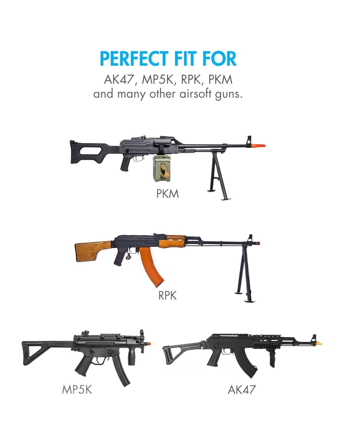 - Compatible con armas de airsoft como: AK47, MP5K, RPK, PKM, CYMA CM.028U, Crosman Pulse R76, GR8, DE UMP M89, Kalashnikov, Stg44, ERICS13, SIG 552 y otras AEG mejoradas y/o modificadas, recomendamos medir el compartimento del arma para un mejor ajuste.