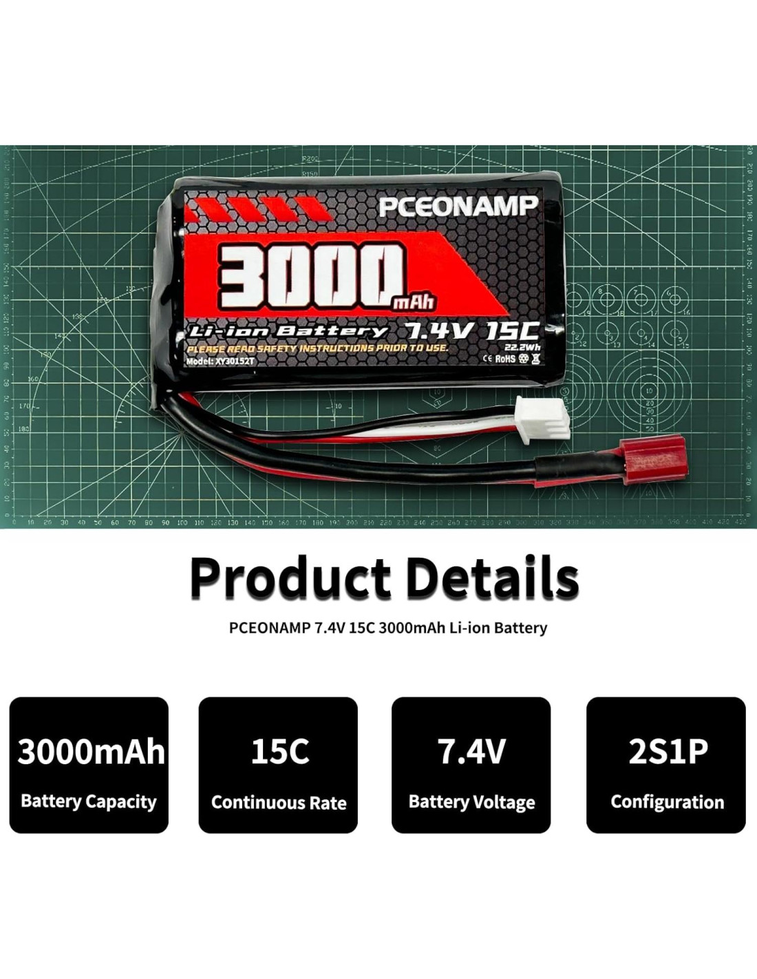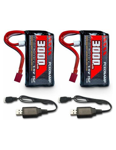 - Lo que obtienes: 2 paquetes de batería li-ion 7.4V 3000mAh 15C 2S PCEONAMP, 2 piezas de cable de cargador USB, manual del usuario. Cualquier pregunta sobre el producto, por favor contáctanos, te responderemos dentro de 24 horas.