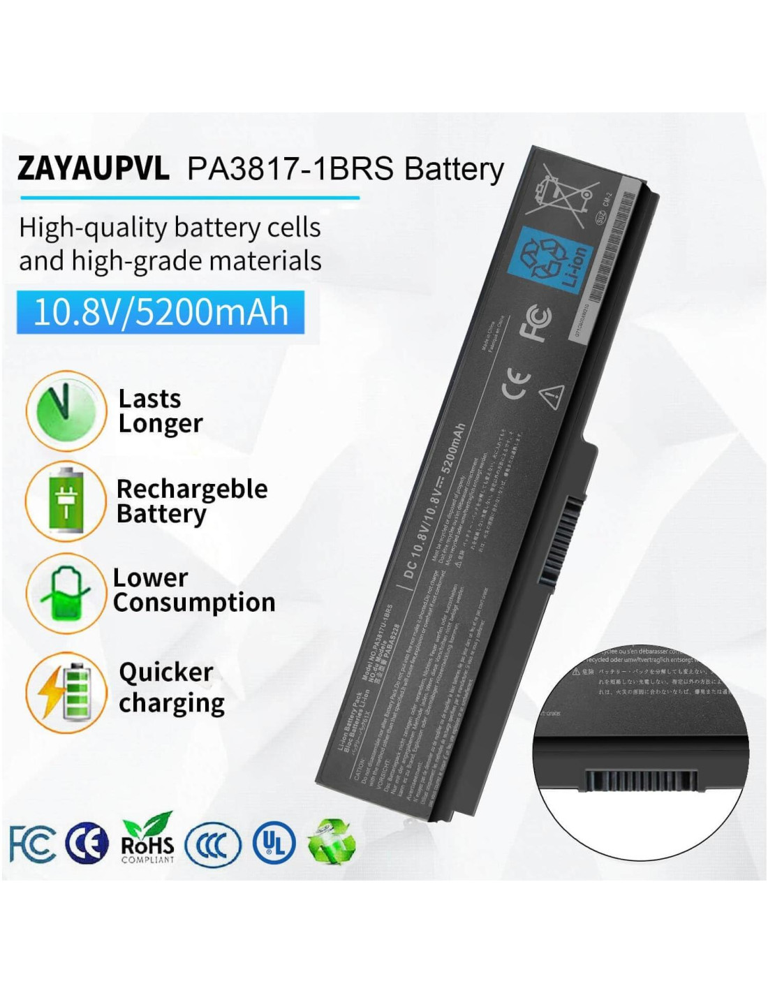 - Especificaciones: Modelo No: PA3817U-1BRS Voltaje: 10.8V; Capacidad: 58Wh / 5200mAh; Celdas: 6 celdas; Color: Negro; Condición: Nuevo; Paquete incluye: 1x batería de reemplazo PA3817U-1BRS para toshiba y 1 manual de instrucciones
