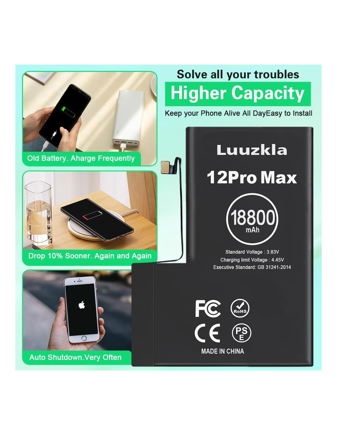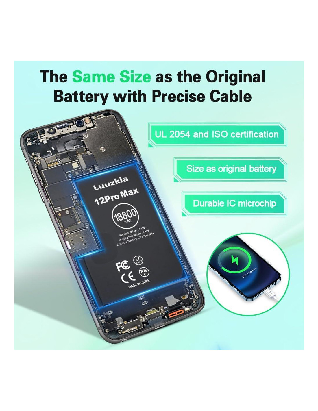 - 18800mAh Alta Capacidad 18800mAh Super batería Compatible con iPhone 12 Pro Max potencia más que la Original u Otra Batería. Nueva 0 ciclos, dura más de 2000 ciclos. Haz que tu iPhone 12 Pro Max dure más y reduce tus tiempos de recarga. ¡Di adiós a los problemas de baterías antiguas insuficientes!