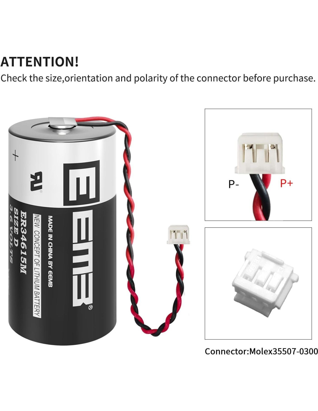 - Información Básica-Esta es una batería No Recargable. No recargue la batería. Voltaje: 3.6V; Capacidad típica: 13000mAh, Longitud del Cable: 100mm (3.94 pulgadas); Conector: Molex35507-03. Debe Confirmar antes de la Compra: 1. Tamaño de la Batería; 2. Modelo de Conector; 3. Tamaño de Conector; 4. Polaridad del Conector - Esto no es universal (Causará un cortocircuito si la polaridad del conector de la batería no coincide con su dispositivo.)