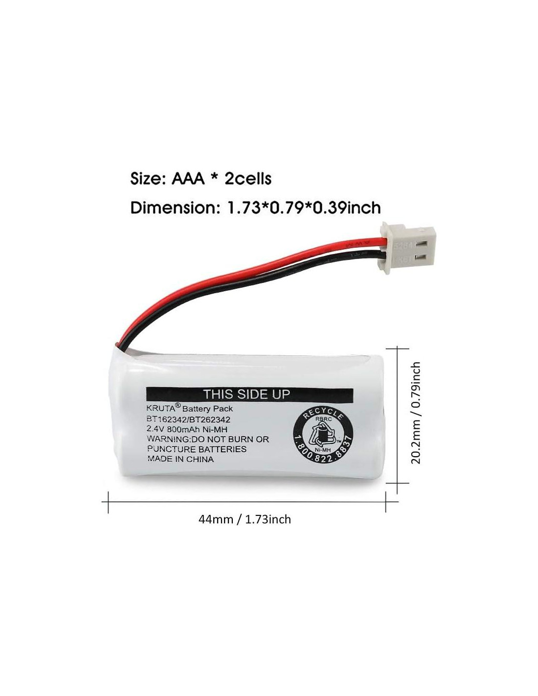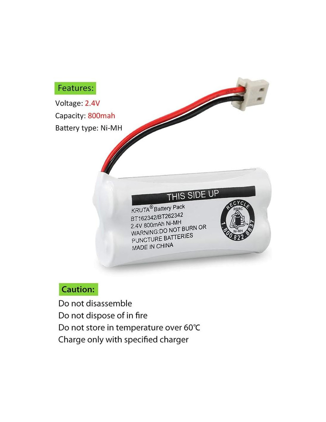 Paquete de batería Ni-MH Kruta BT183342/BT283342 BT162342/BT262342 2.4V 800mAh para teléfonos inalámbricos Vtech AT&T (Paquete de 4) ESPECIFICACIONES: Voltaje: 2.4V Capacidad: 800mAh Tipo: Ni-MH Recargable: Sí Tamaño: 2 celdas AAA Dimensiones: 44*20.2*10mm / 1.73*0.79*0.39 pulgadas Protección contra sobrevoltaje, sobrecorriente, sobrecarga y cortocircuito & Mejor longitud de cable para el espacio Compatible con los siguientes sistemas de teléfonos inalámbricos, teléfonos inalámbricos y baterías: VTech: BT183342, BT283342, BT162342, BT-162342, BT1623421, BT-1623421, BT166342, BT-166342, CS80100, CS81100, CS82100, CS82300, CS82350, DS6501, DS6511, DS6521, DS6521-2, DS65212, DS6521-3, DS65213, DS6522-3, DS65223, DS6522-32, DS652232, DS6522-4, DS65224, DS6601, DS6641, DS6642, DS6648-2, DS66482, DS6649, DS6649-2, DS66492, DS6649-3, DS66493, FS6214, FS6224, LS6001, LS6105, LS6185, LS6305, LS6315, LS6325, LS6325-3, LS63253, LS6325-4, LS63254, LS6375 AT&T: BT166342, BT-166342, BT266342, BT-266342, CL84100, CL84200, CL84250, CL84300, EL2100, EL51100, EL51200, EL51250, EL52100, EL5220, EL52200, EL52210, EL52250, EL52300, EL52350, EL52400, EL52450, EL52500, EL52510, TL30100, TL32100, TL32200, TL32300, TL86009, TL86109, TL90070, TL90071, TL90700, TL91270, TL91370, TL92220, TL92270, TL92271, TL92320, TL92370, TL92371, TL92420, TL92470, TL92471 Dantona: BATT-E30025CL, BATTE30025CL American Telecom: E30021CL, E30022CL, E30023CL, E30025CL, LH070-2A43C2BRML1P Empire: CPH-515J, CPH515J Energizer: ER-P254, ERP254 GE: 30522EE1, 30522EE2, 30522EE3, 30522EE4, 30524EE2, 31591 Baterías de Interstate: ATEL0068, TEL0068 Reemplazo compatible para baterías: BT183342 BT283342 BT166342 BT266342 BT162342 BT262342