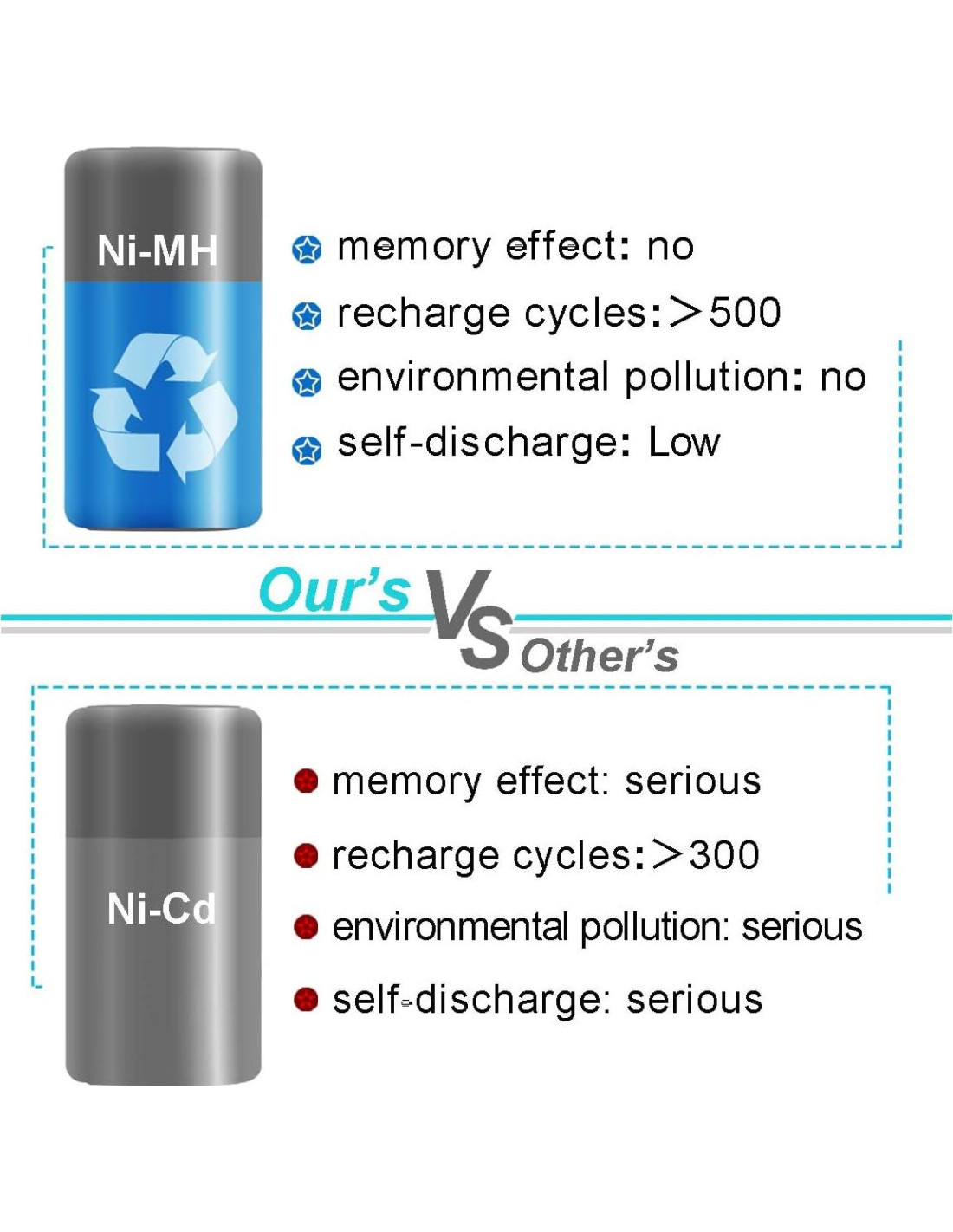 - Celdas de batería Ni-MH ecológicas en su interior, la batería Ni-MH no tiene Pb/Hg/Cd, no contamina el entorno y es conveniente de gestionar cuando no se usa, a diferencia de la batería Ni-Cd que contiene elemento Cd que puede contaminar el medio ambiente.