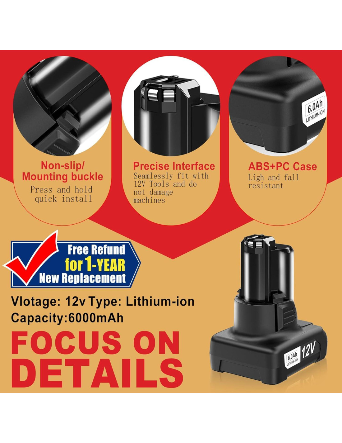 - [Especificación Básica]: Tipo de Batería: Litio-ion | Voltaje: 12V | Capacidad: 6000mAh | Potencia: 72Wh | Peso: 365g (0.8 lb) /Por | Removible y Recargable | Reemplazo para OEM