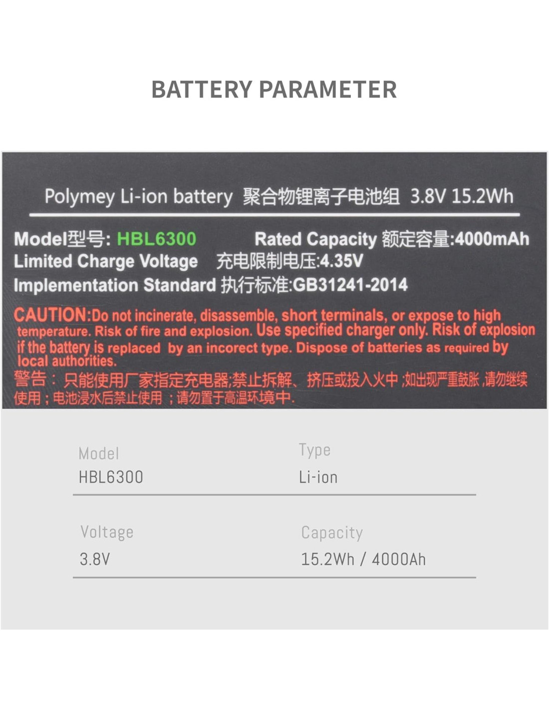 - Parámetros: Batería de iones de litio; Voltaje: 3.8V; Capacidad: 3800mah (14.5Wh); Tipo: Li-ion, Color: Negro; Tiempo de funcionamiento: >60 minutos por carga