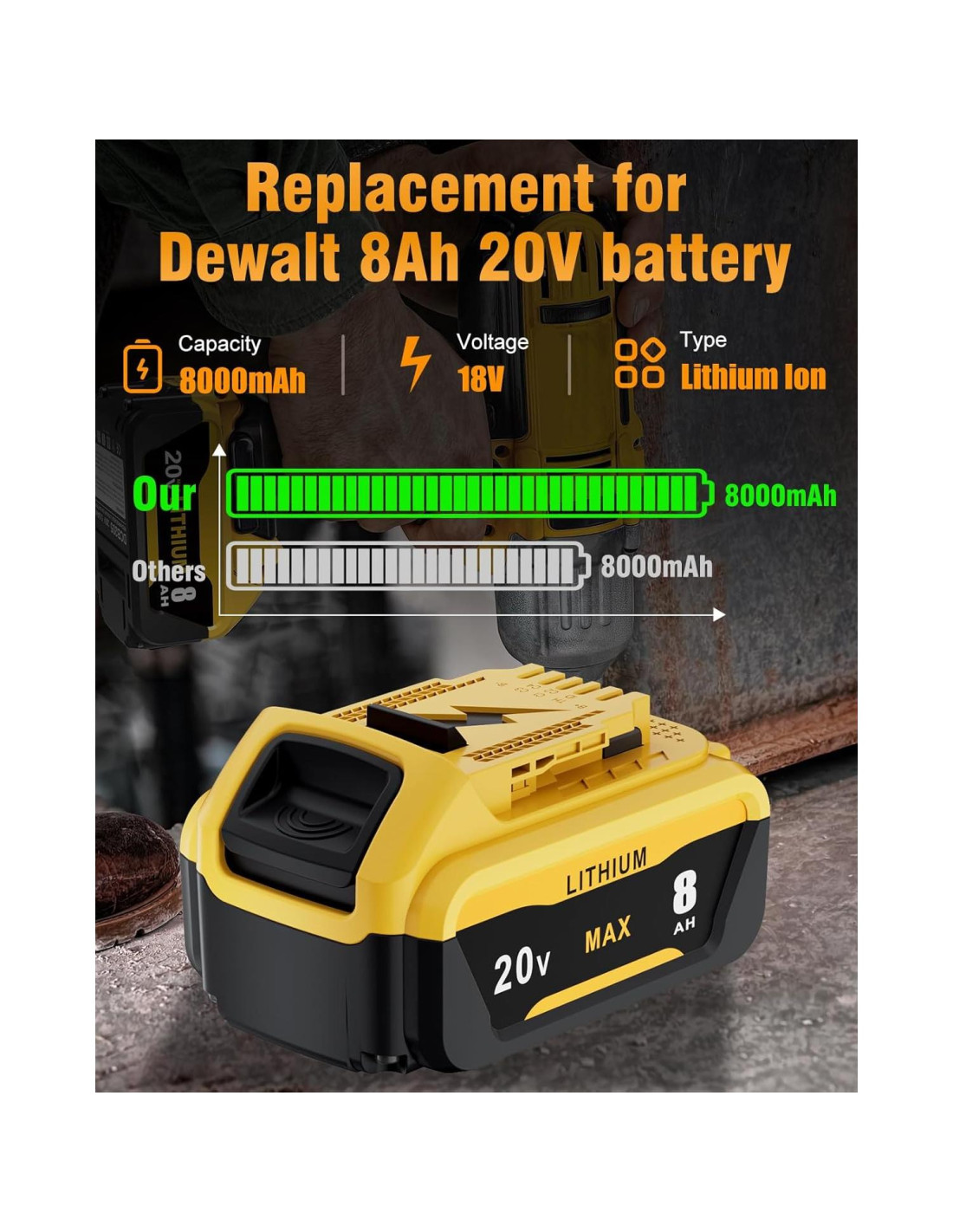 - Capacidad Mejorada 8.0Ah: Sin efecto memoria, proporciona un 50% más de tiempo de funcionamiento que el reemplazo de batería Dewalt 20V MAX de 6Ah de otros.