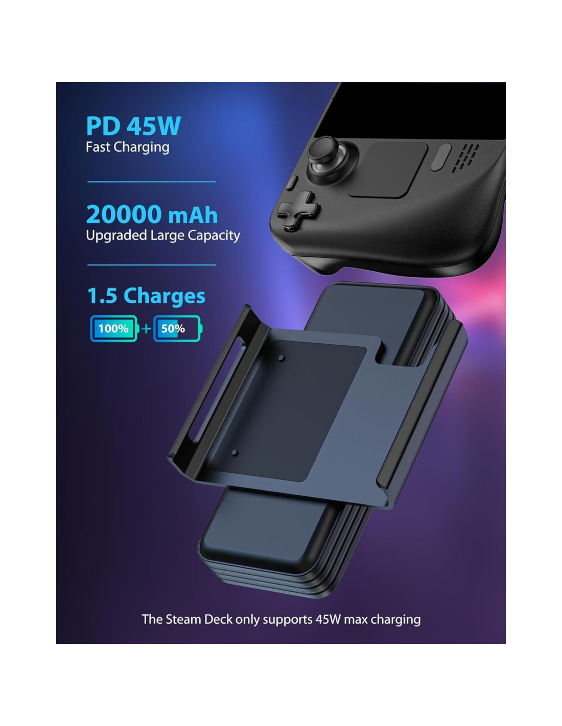 - Batería de Carga Rápida de 20000mAh PD 45W: Este paquete de batería portátil puede cargar tu dispositivo como el cargador original del steam deck. La batería recargable de 20000mAh incorporada puede alimentar tu Steam Deck del 0% al 100% 1.5 veces. (La potencia máxima aceptada por SteamDeck es 45W y no puede alcanzar 65W de potencia de carga.)
