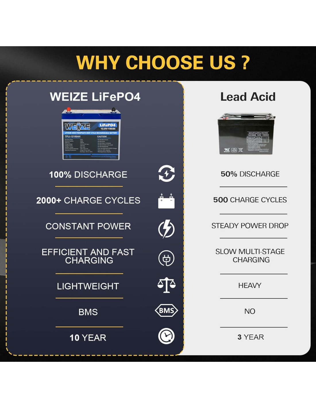 - NUESTRO SERVICIO: Como la marca número 1 de baterías de plomo-ácido en Amazon, las más recientes Baterías de Fosfato de Hierro de Litio Weize están garantizadas con confianza por 10 años. Apuntamos a la calidad seguida de un servicio al cliente de calidad, Amazon no se encarga de la devolución de productos relacionados con baterías, así que por favor contacte directamente al vendedor. El equipo de soporte de Weize está disponible para USTED. Por favor cargue la batería con un CARGADOR DE BATERÍA DE LITIO dedicado, y no más de 4 baterías en serie.