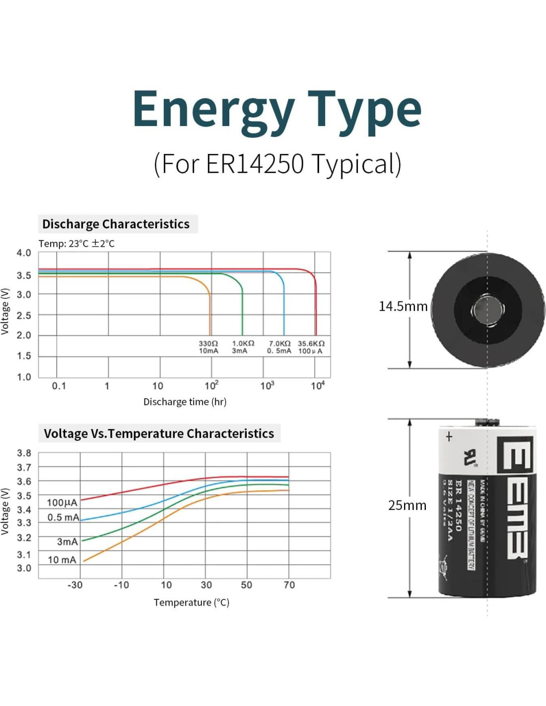- Rendimiento Potente: batería de litio de cloruro de tiol con tamaño 1/2 AA no recargable de 3.6V y capacidad de 1200 mAh, ideal para dispositivos de bajo consumo. Mide 14.5 x 25 mm, opera de -55C a +85C.