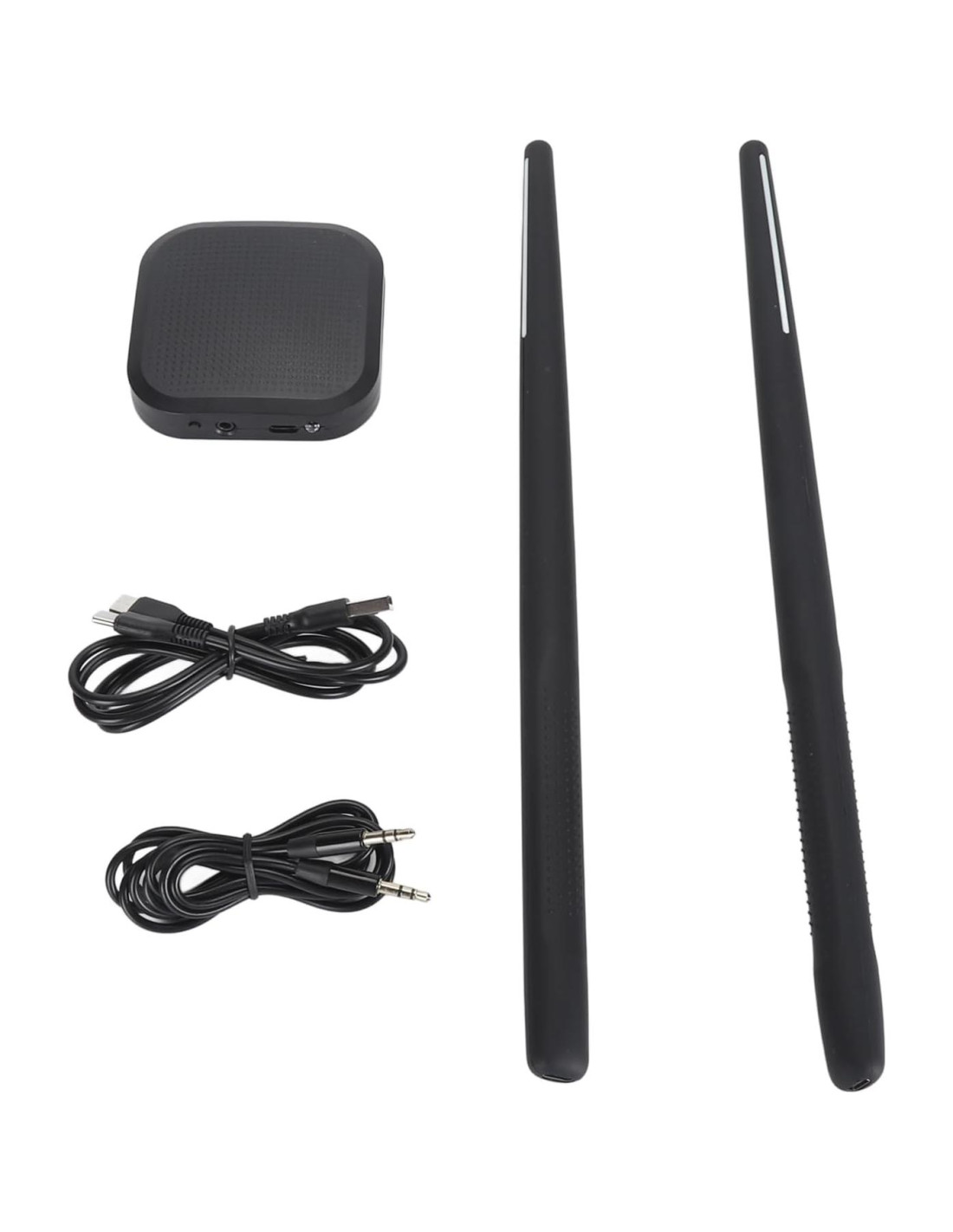 - Posicionamiento: El kit de batería de aire utiliza tecnología avanzada de detección de movimiento 3D para identificar exactamente dónde está golpeando la baqueta, y luego reproduce instantáneamente el sonido de batería correspondiente a través de un dispositivo de sonido conectado.
