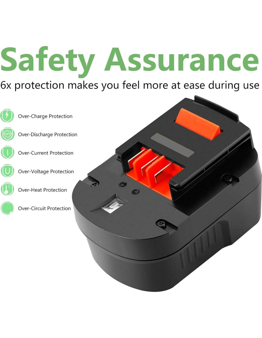 Futuro de la batería: 1. Alta capacidad proporciona un tiempo de funcionamiento mucho más largo con una carga completa, hace que tus herramientas eléctricas sean más potentes. 2. Sin efecto memoria y baja autodescarga. Se puede cargar o descargar según sea necesario sin pérdida de capacidad. 3. La densidad de energía de la batería es mayor que la de la batería Ni-CD, la hace más pequeña y ligera. 4. Todas las baterías tienen certificación CE, FCC, RoHS. Probadas por el fabricante para igualar o superar la calidad de los productos OEM, más seguras de usar. 5. La batería no contiene sustancias nocivas (Cd, Pb, Hg), protege tu salud, no contamina el medio ambiente. 6. Batería 100% adecuada para cargador original Ni-Cd. Reemplazo para modo de batería: (Por favor busca con "Ctrl+F") Para BLACK & DECKER A12, A12-XJ, A12EX, A1712, FS120B, FSB12, HPB12 Firestorm FS120B, FS120BX Compatible con modo de herramienta: (Por favor busca con "Ctrl+F") Para Taladros y Destornilladores Black & Decker: BD12PSK, BDG1200K, BDGL12K, BDID1202, CD1200SK, CD12SFK, CDC1200K, CDC120AK, CDC120ASB, CP122K, CP122KB, CP12K CP12KB, EPC12, EPC126, EPC126BK, EPC12CA, EPC12CABK, HP122K, HP122KD, HP126F2B, HP126F2K, HP126F3B HP126F3K, HP126FBH, HP126FSC, HP126FSH, HP126K, HP128F3B, HP12K, HP12KD, HPD1200, HPD1202 HPD1202KF, HPD12K-2, PS122K, PS122KB, PS12HAK, SS12, SX3000, SX3500, XD1200, XD1200K, XTC121 Para Llaves de Impacto Black & Decker: SX5000, XTC12IK, XTC12IKH Para Herramientas Múltiples Black & Decker: KC2000FK Para Clavadoras Black & Decker: BDBN1202 Para Destornilladores Black & Decker: HP9019K