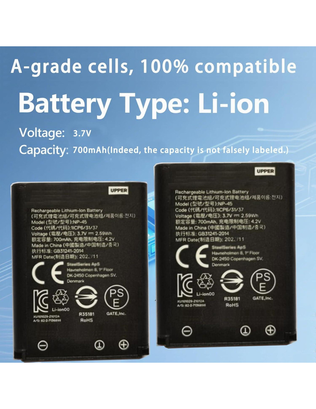 - Este paquete incluye 2 piezas de baterías de reemplazo NP-45/NP-45A/NP-45B/NP-45S, diseñadas exclusivamente para dispositivos específicos: Para auriculares de juego multi-sistema Arctis Nova Pro Wireless (compatible con Xbox, PlayStation) Para cámaras Fujifilm: INSTAX Mini 90, FinePix XP140/130/120/90/80/70/60/30/20, T560/550/510/500/400/360 Por favor, confirme que el modelo de batería original de su dispositivo coincide (no para otros modelos) para asegurar un ajuste perfecto.