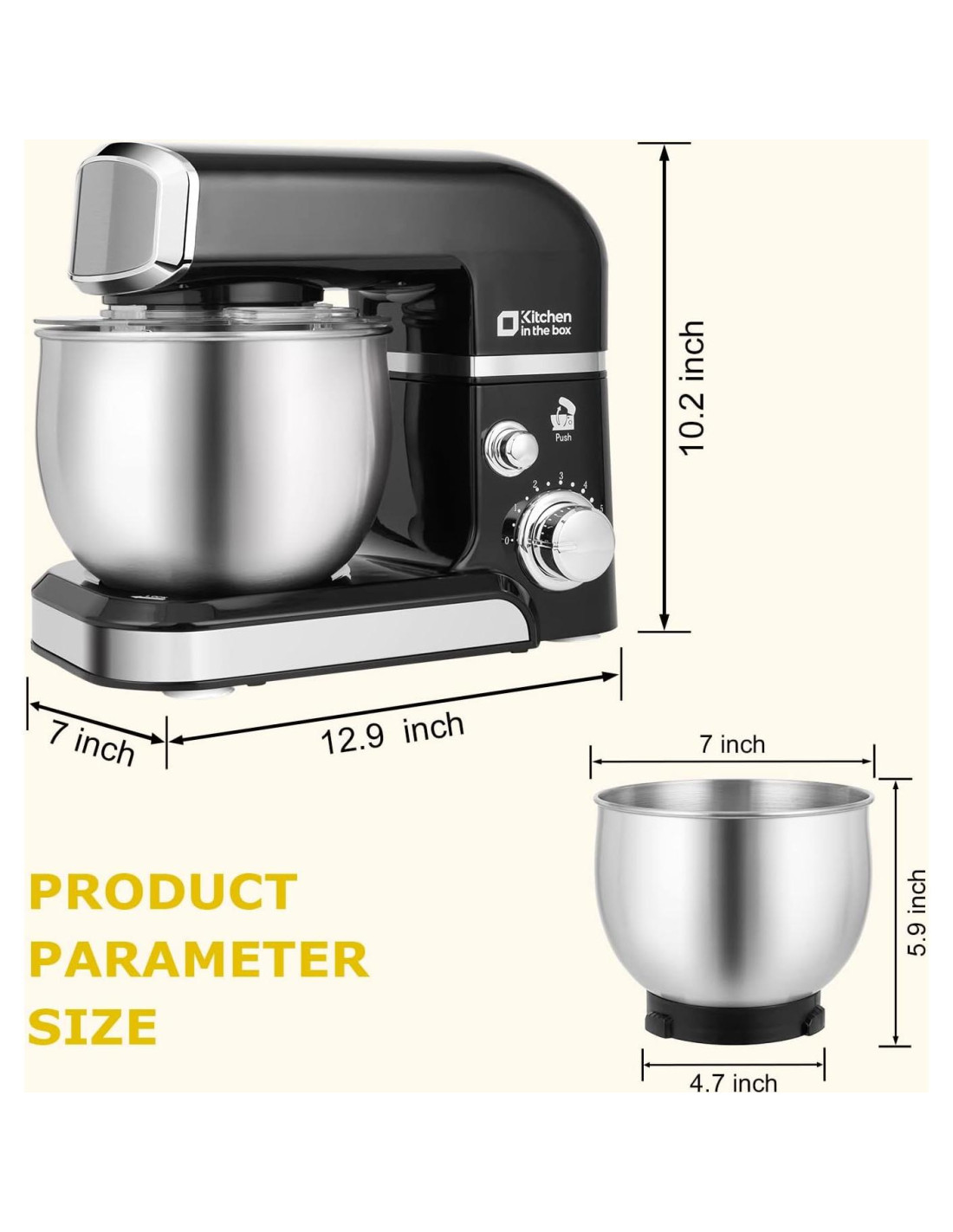 Batidora de pie Kitchen in the box, el mejor asistente de tu cocina. El cuerpo del artículo pesa menos de 7 lbs (3,18 kg) con dimensiones de 12.9*7*10.2 in (32,77 cm*17,78 cm*25,91 cm) que se puede almacenar fácilmente en el gabinete, ¡un buen ayudante para ahorrar espacio! Además, nuestro mezclador de cocina tiene seis colores para elegir, satisfaciendo diferentes necesidades estéticas. Como mezclador diario, es fácil de operar y limpiar, presiona el botón para apagar la cabeza inclinable cuando el mezclador está en funcionamiento, lo que es más seguro. Y la tapa transparente anti-salpicaduras podría evitar que los ingredientes hagan un desastre.