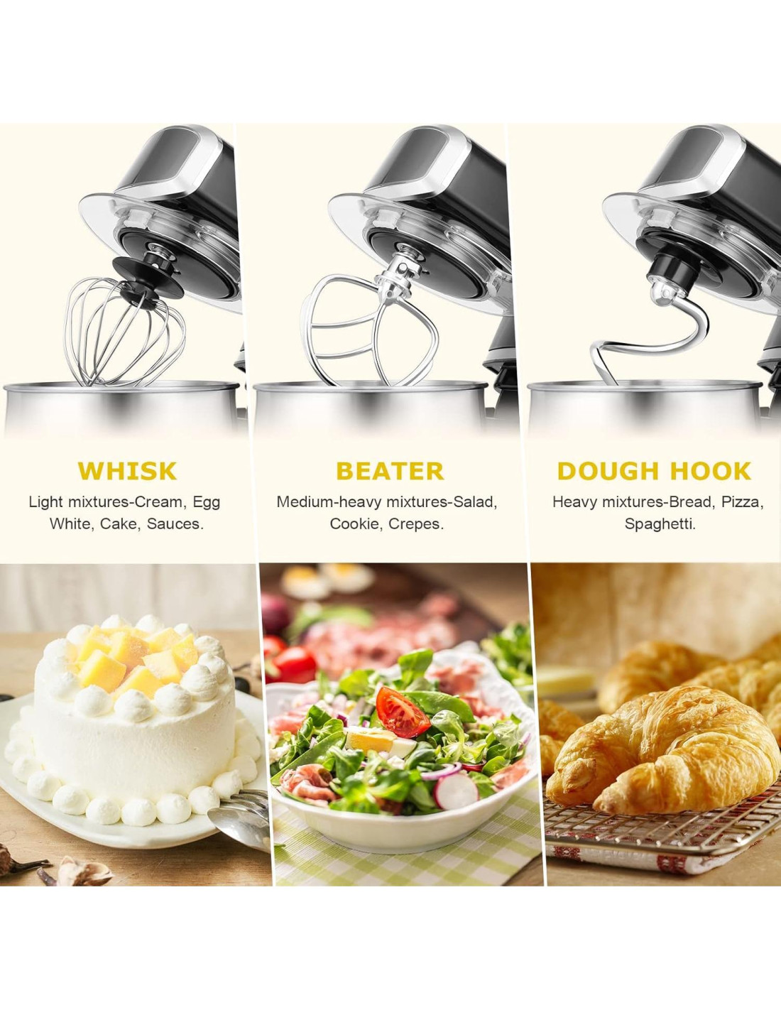 - Accesorios múltiples mejorados - Gancho para masa de aluminio y batidor plano, batidor de acero inoxidable son fáciles de acoplar, utilizando material mejorado, más resistente y duradero. Hay una junta en la parte superior para evitar que los residuos de alimentos salpiquen en la junta para hacer la limpieza más conveniente.