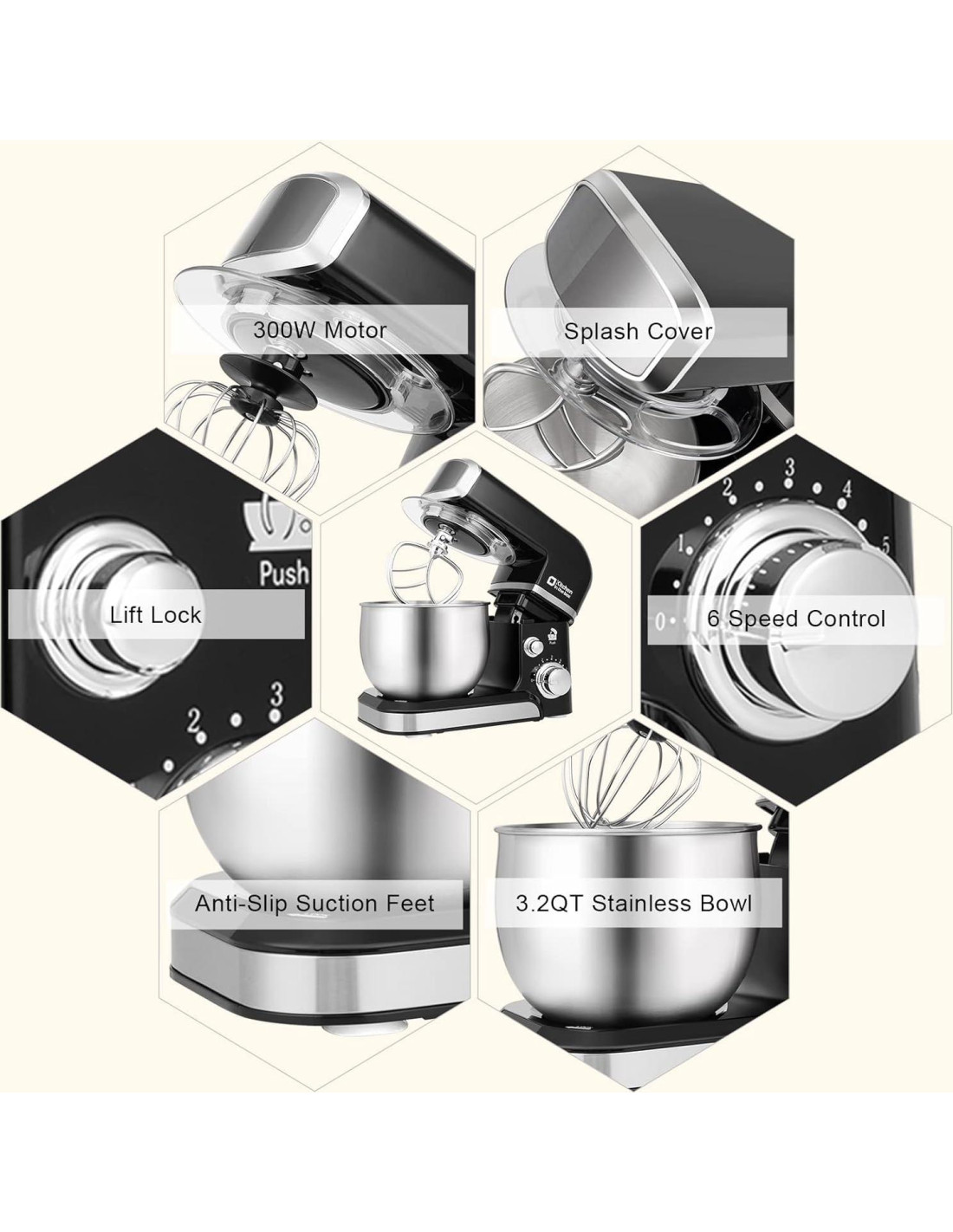 - Capacidad de 3.2Qt y diseño de cabeza inclinable - Nuestro pequeño mezclador de cocina está equipado con un tazón de acero inoxidable de 3.2Qt, adecuado para nuevos panaderos, familias de 1-2 miembros o parejas, fácil de operar y limpiar. El diseño de la batidora con cabeza inclinable permite acceder para instalar o desinstalar el tazón y los accesorios fácilmente. Y la tapa transparente anti-salpicaduras podría evitar que los ingredientes hagan un desastre.