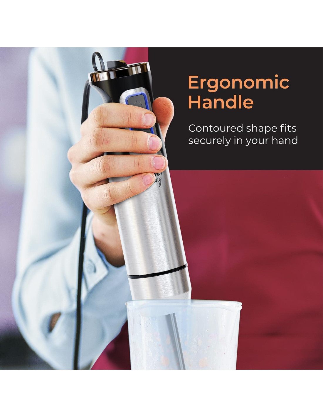 - No más grumos - Mezcla, bate, y espumosa rápidamente con nuestra batidora de inmersión delgada pero poderosa. Incluye accesorios desmontables para hacer batidos, crema batida, e incluso huevos batidos.