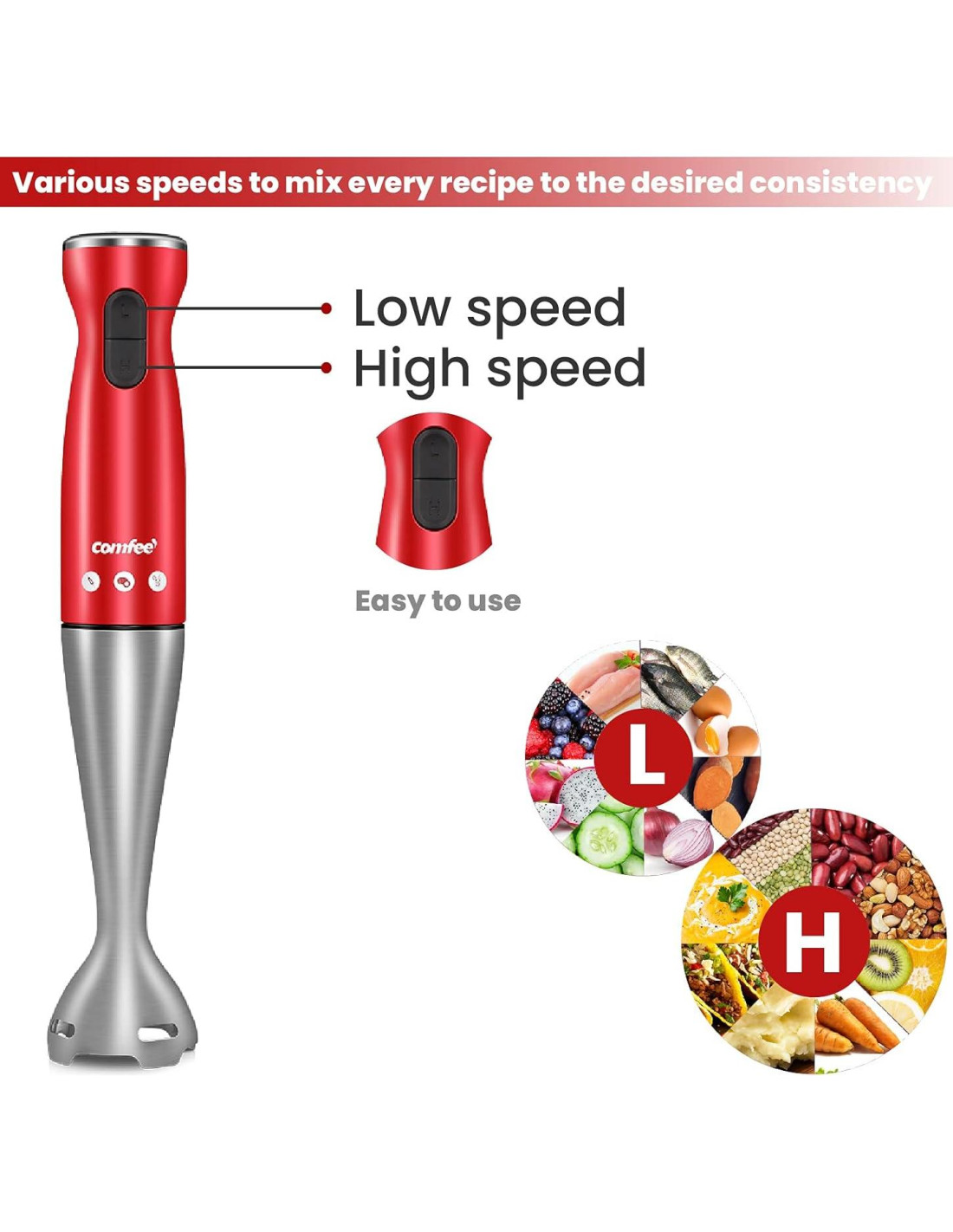 La batidora de inmersión 3 en 1 de COMFEE' es un asistente de cocina pequeño ideal para hacer comida de bebé, cremas batidas, batidos, salsas, sopas, etc. Con control de 2 velocidades, solo toma segundos mezclar, picar o batir, es eficiente y poderosa. El mango de diseño ergonómico ofrece un agarre cómodo durante la mezcla continua. Este esencial de cocina es versátil, fácil de usar y almacenar.