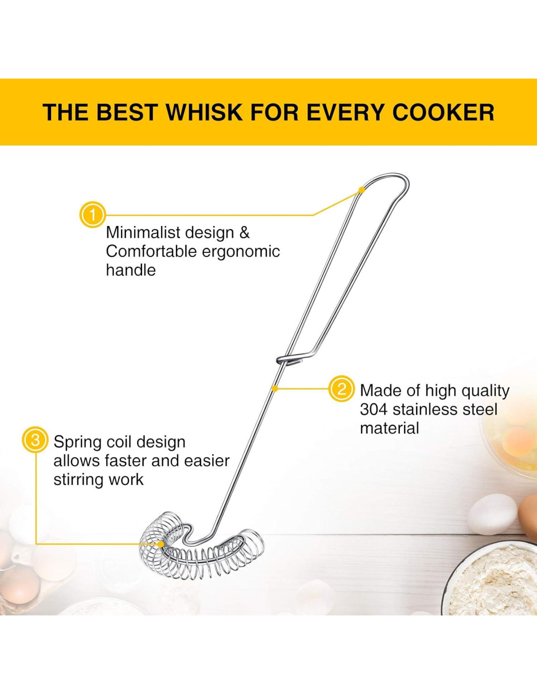 - Resorte en espiral: el diseño del resorte en espiral proporciona al batidor pequeño una buena flexibilidad, por lo que puedes crear fácilmente una acción de batido, haciendo que el proceso de mezclar sea mucho más fácil y agradable