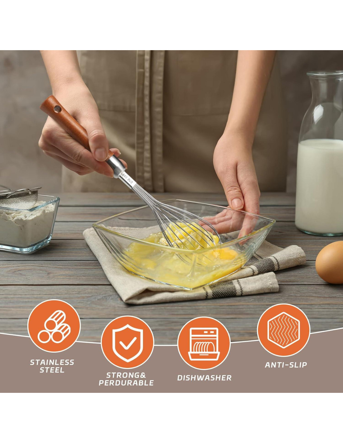 - Cómodo de Usar: El batidor de metal está equipado con un mango de madera antideslizante, proporcionándote un agarre cómodo y seguro. El diseño ergonómico previene la fatiga de la mano, haciendo que batir y mezclar ingredientes sea fácil y cómodo.