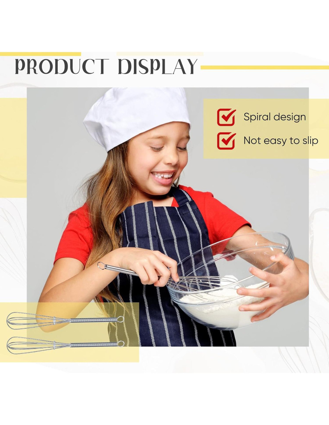 - Diseño de Mango de Agarre Fácil: nuestro batidor de huevos cuenta con un pequeño mango cilíndrico, diseñado para un agarre fácil y comodidad; Este diseño es adecuado para aquellos con manos pequeñas ya que es sencillo de sostener y maniobrar mientras cocinas y horneas