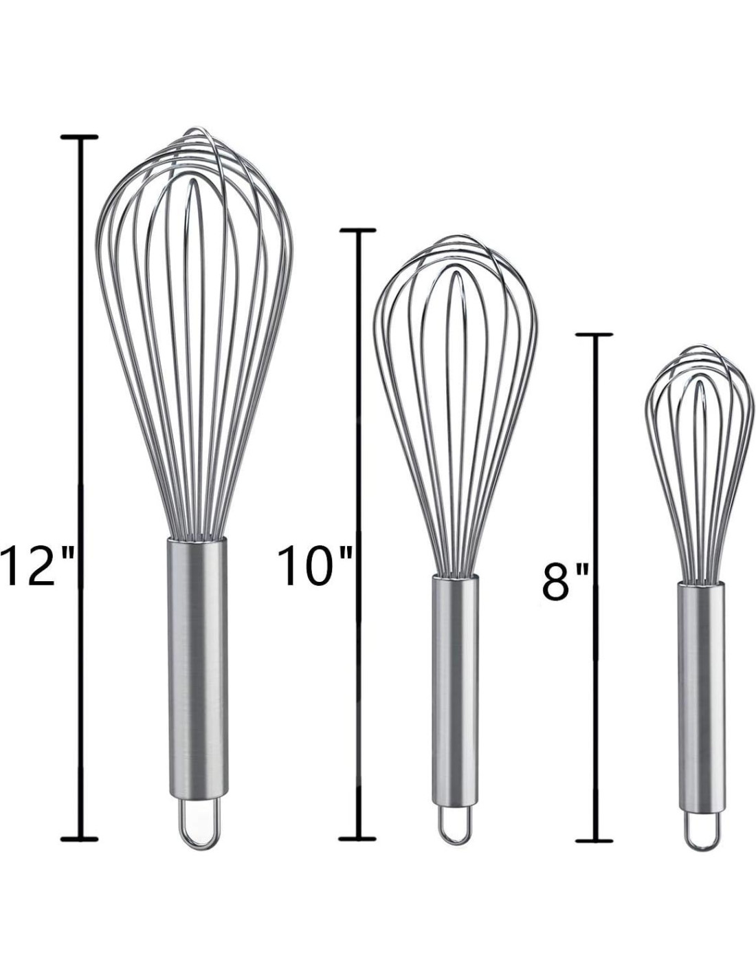 - [Juego de batidores de acero inoxidable imprescindible para principiantes]: 3 batidores de alambre de acero inoxidable de diferentes tamaños (30 cm + 25 cm + 20 cm) con ganchos. No es necesario realizar múltiples compras, todo en una sola demanda.