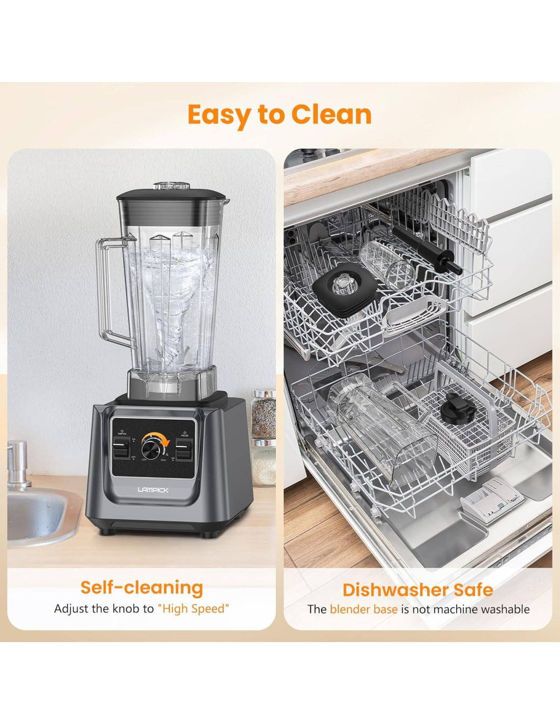 - Autolimpiante y Apto para Lavavajillas: Limpiar nuestro mezclador de batidos es muy fácil. Solo agrega un poco de jabón para platos y agua tibia, y tu mezclador de alimentos profesional LAMPICK puede completar el proceso de limpieza de forma autónoma en 30 a 60 segundos. La jarra libre de BPA, la taza para llevar y el pisón (excluyendo la base) son aptos para lavavajillas. Pasa menos tiempo limpiando y más tiempo disfrutando de tus bebidas recién mezcladas.