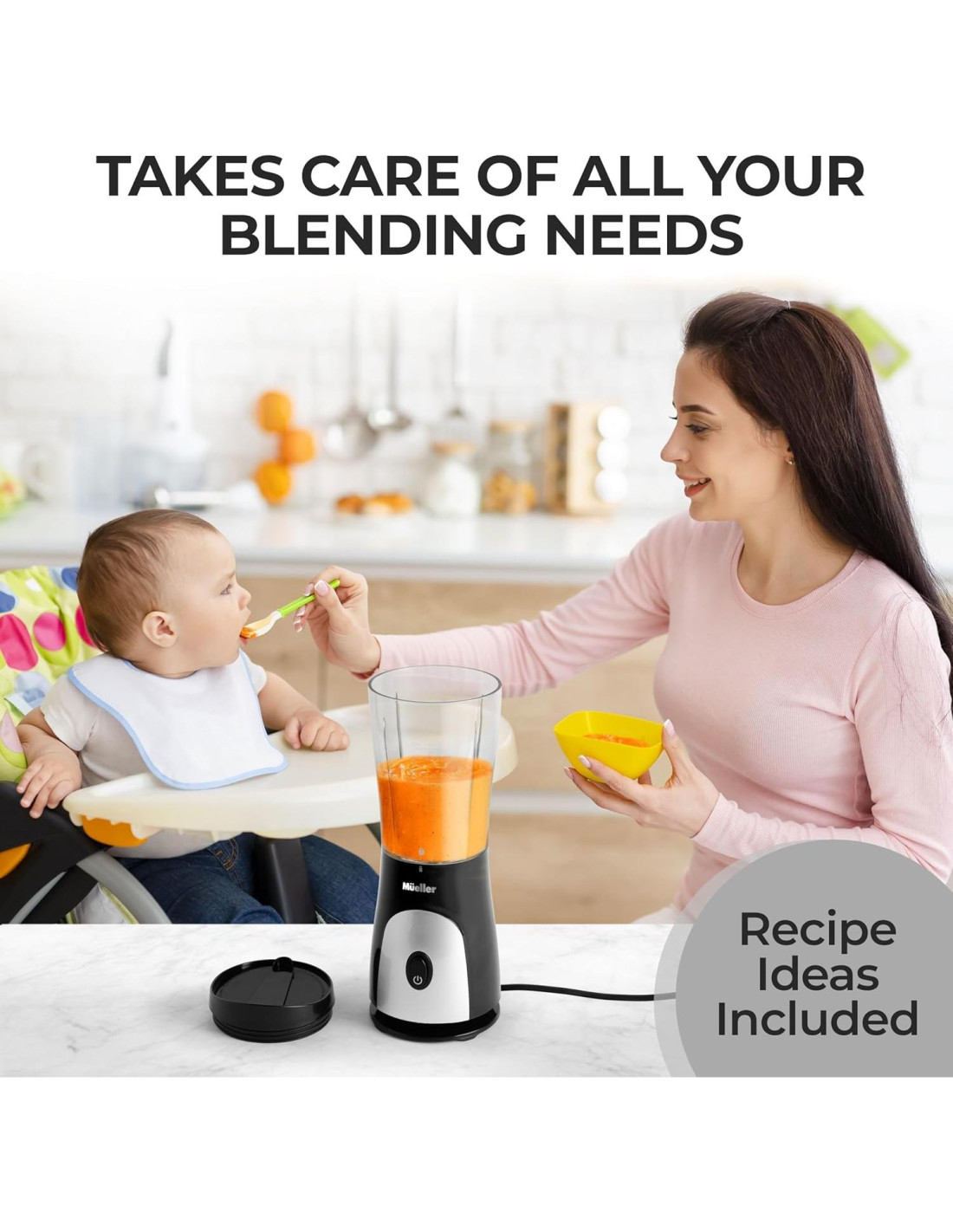 Mezclador Personal Mueller de Alta Resistencia para Batidos y Smoothies con una Taza de Viaje de 15 Oz (0.44L) y Tapa, Jugos, Comida para Bebés, Mezclador Portátil y Procesador de Alimentos, Negro