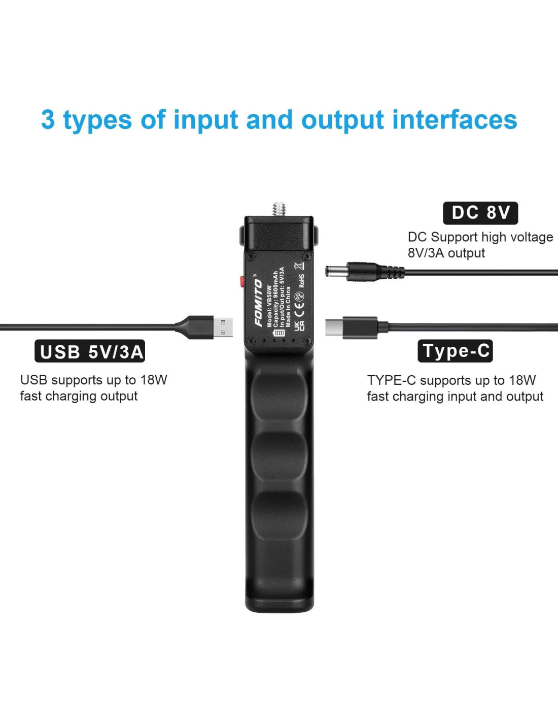 - La empuñadura de carga VB50W tiene puertos de salida USB y tipo-C, permitiendo que su dispositivo en la parte superior se cargue durante la producción, que también es capaz de cargar dos dispositivos al mismo tiempo.