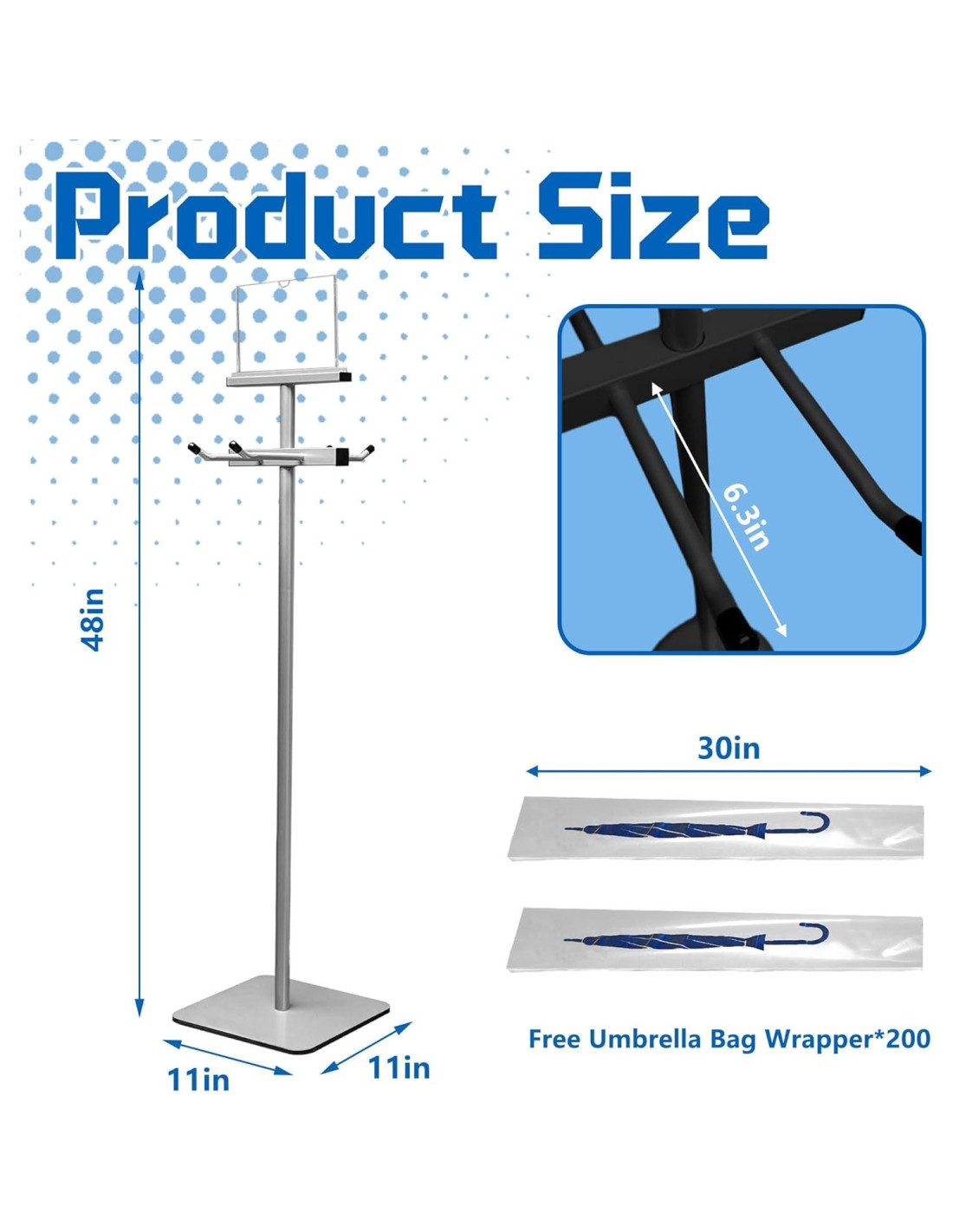 - Calidad Superior Hecho de metal premium, nuestro soporte de bolsa para paraguas ofrece excelente resistencia a la corrosión y durabilidad a largo plazo. Con un diseño moderno y elegante, es perfecto para cualquier espacio público. La funcionalidad de doble cara del soporte ofrece comodidad adicional, y el soporte de señal integrado le permite mostrar mensajes personalizados, dando a su lugar un aspecto pulido.