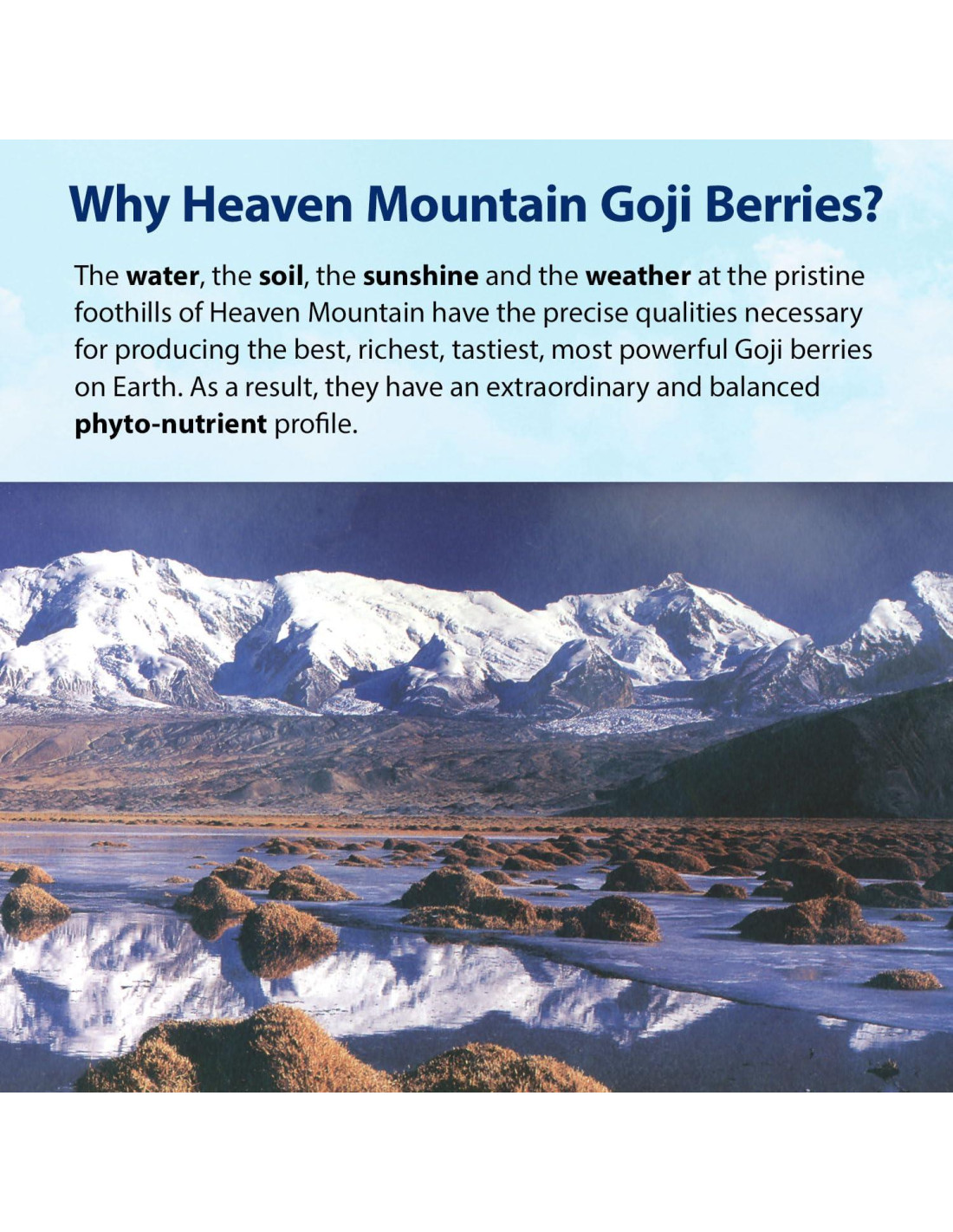 - El agua, el suelo, la luz solar y el clima en las prístinas laderas del Cielo tienen las cualidades precisas necesarias para producir las mejores, más ricas, sabrosas y poderosas bayas de Goji en la Tierra. Como resultado, tienen un perfil de fitonutrientes extraordinario y equilibrado.
