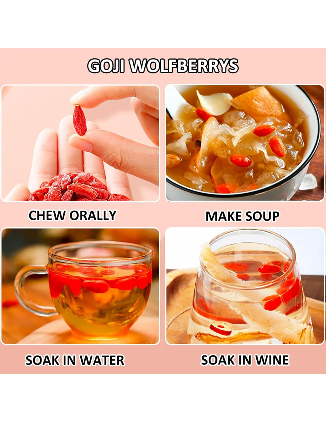 - Snack en cualquier momento y lugar: Con su sabor naturalmente dulce y textura masticable, las bayas de goji son una adición deliciosa a tu dieta