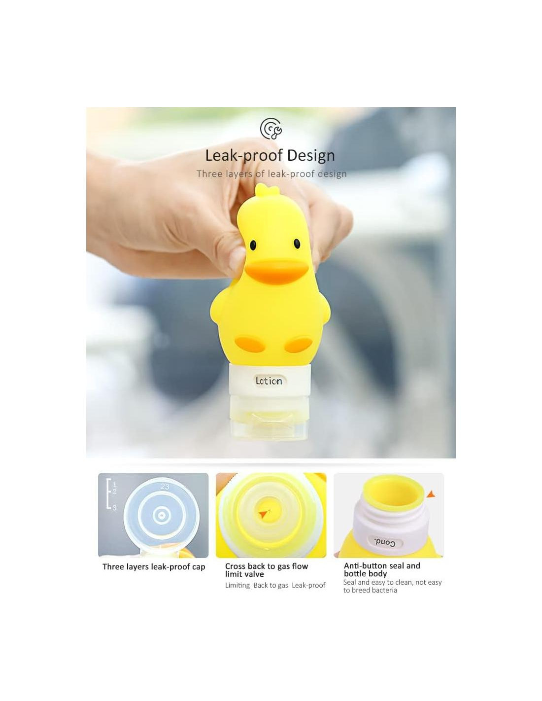 - Componentes incluidos: Bolsa de tocador transparente x 1, Botella de silicona x 4: Monstruo pequeño 2oz(60ml), Oso 2.6oz(80ml), Pingüino 3oz(90ml), Pato 3.4oz(100ml)