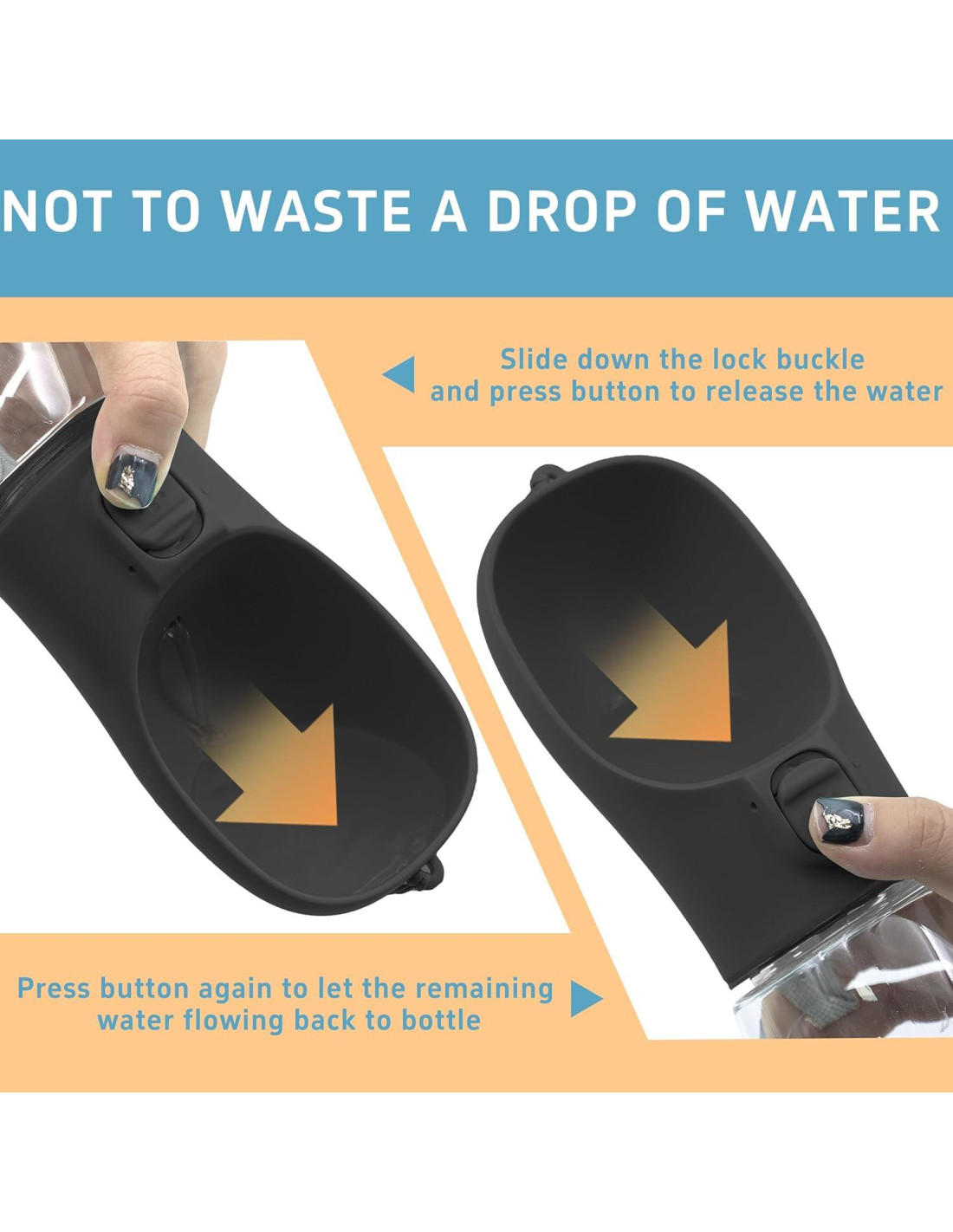 - Fácil de Operar: Esta botella de agua para mascotas es muy conveniente de usar, operación con una mano, desliza hacia abajo el broche de bloqueo y presiona el botón para liberar el agua, deslizar hacia arriba el broche de bloqueo puede prevenir fugas de agua causadas por tocar accidentalmente el botón, un punto muy importante es que el agua restante en el cuenco puede fluir de regreso a la botella. Esta botella de agua para perros facilita que los perros beban y cuiden las fuentes de agua, sin desperdiciar una gota de agua.