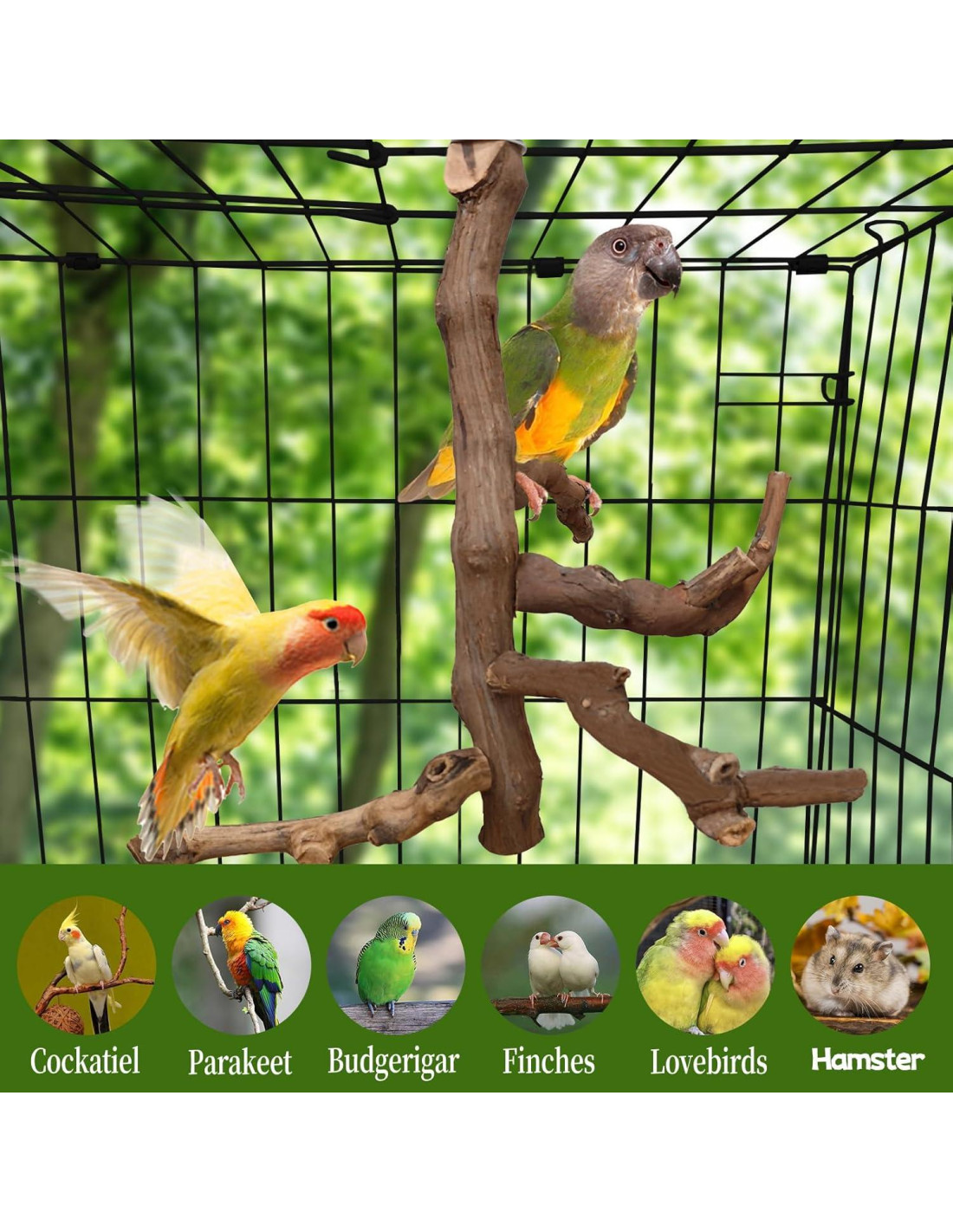 - Fácil Instalación: Equipado con tornillos y tuercas, nuestra percha para jaula de aves permite una configuración y remoción rápida. Esta resistente percha natural para loros se adapta a todas las jaulas para aves, ofreciendo un hábitat de descanso cómodo.