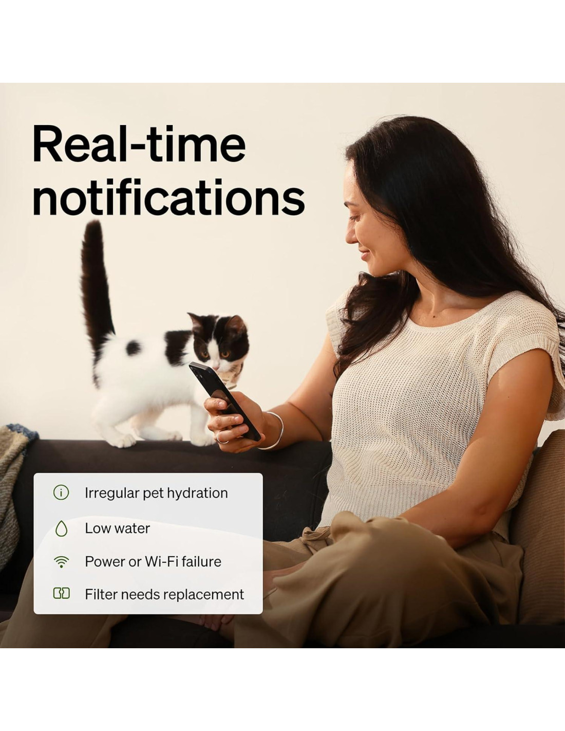 - Recordatorios Inteligentes de la Aplicación: Mantente libre de estrés e informado con notificaciones en tiempo real enviadas a tu teléfono inteligente sobre hidratación irregular de la mascota, bajo nivel de agua, fallo de energía o Wi-Fi, y cuándo necesita ser reemplazado el filtro. (Esta fuente de agua para mascotas es alimentada por la pared; solo la bomba de agua es inalámbrica.)