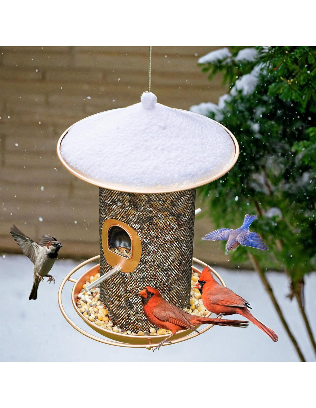- Alta Calidad: Hecho de metal de alta calidad; construido para resistir elementos exteriores incluyendo sol, viento, lluvia y nieve; asegura un uso duradero. Techo de metal liso desalienta a las ardillas y ardillas listadas de robar las semillas.