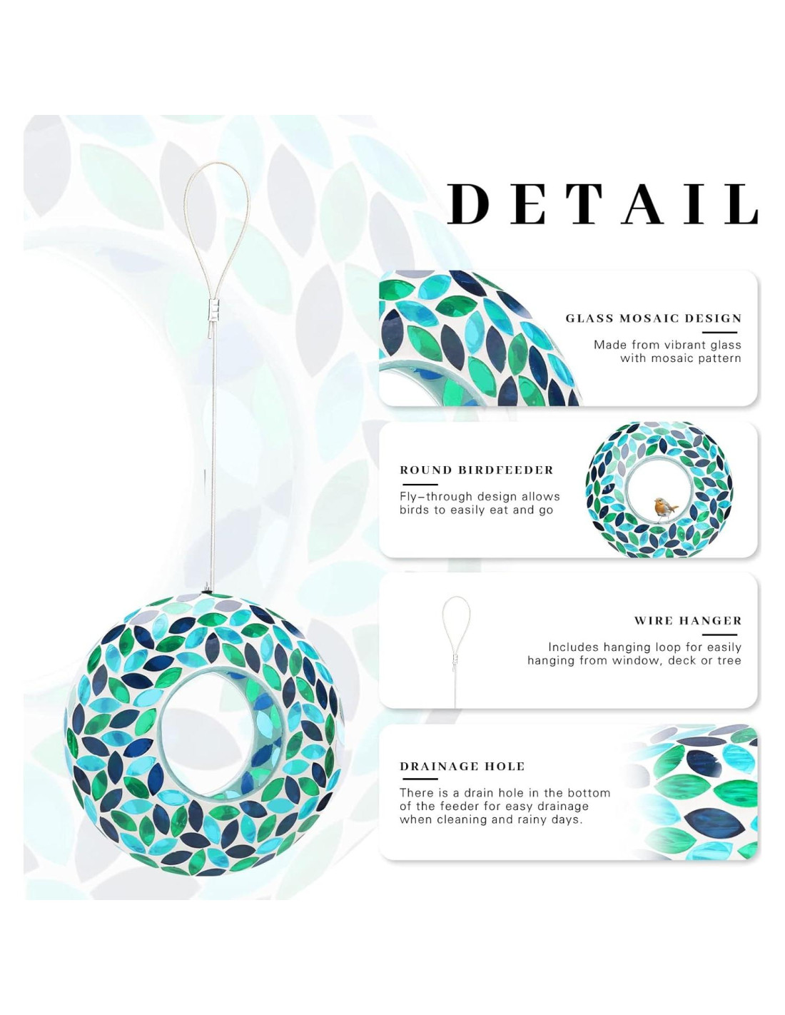 - [Diseño de Mosaico] Este comedero para aves de mosaico redondo con un alambre colgante para que puedas colgar fácilmente el comedero afuera y alegrar tu jardín trasero, patio, césped, terraza o balcón. Captura la luz del sol mientras gira suavemente y brilla. Tamaño: 25.4 x 25.4 x 10.16 centímetros.