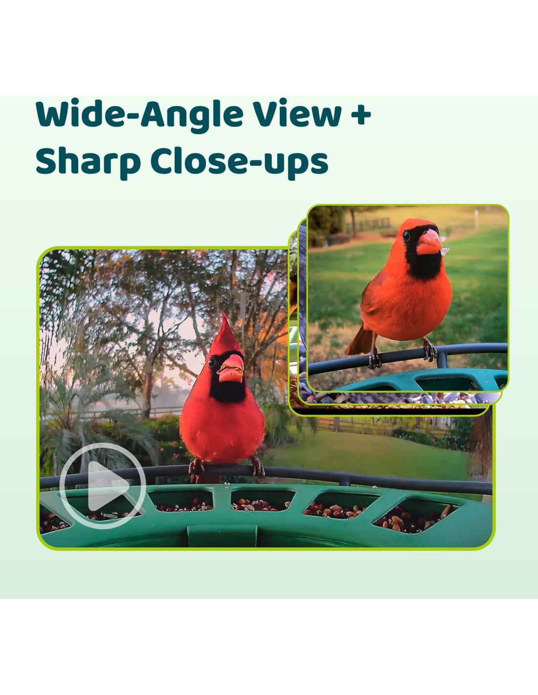 - Cámara de Doble Lente con Visión Nocturna. Captura fotos impresionantes y detalladas con el lente de retrato de 3MP que cuenta con resolución de 2K, mientras que el lente de gran angular de 2MP, el comedero para aves Birdfy proporciona resolución de 1080P con visión nocturna para vistas más amplias.