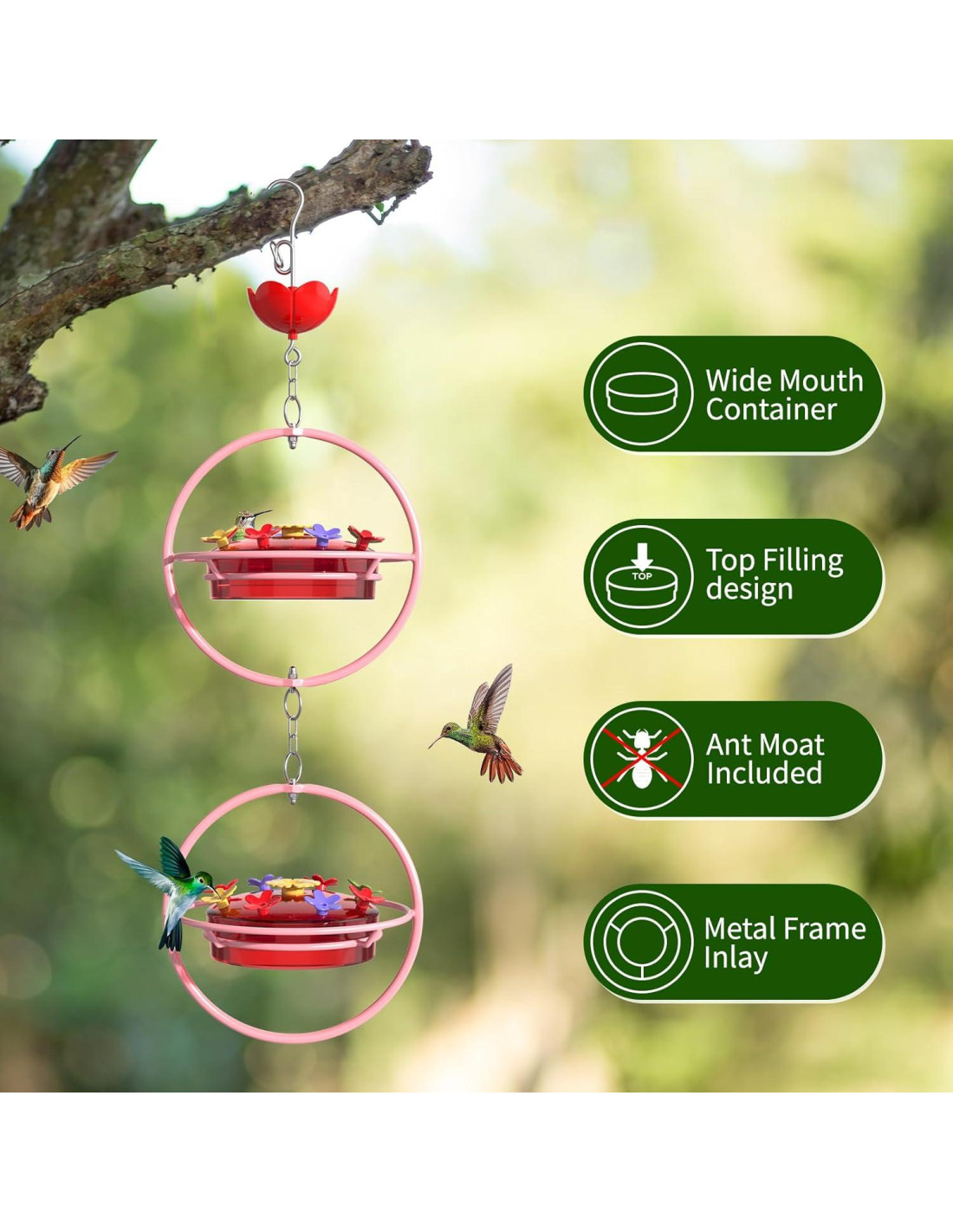 - Contenedor de Boca Ancha para Fácil Llenado y Limpieza: El contenedor plano de boca ancha incrustado hace que agregar néctar y limpiar sea rápido y conveniente, asegurando suministros frescos para los colibríes.