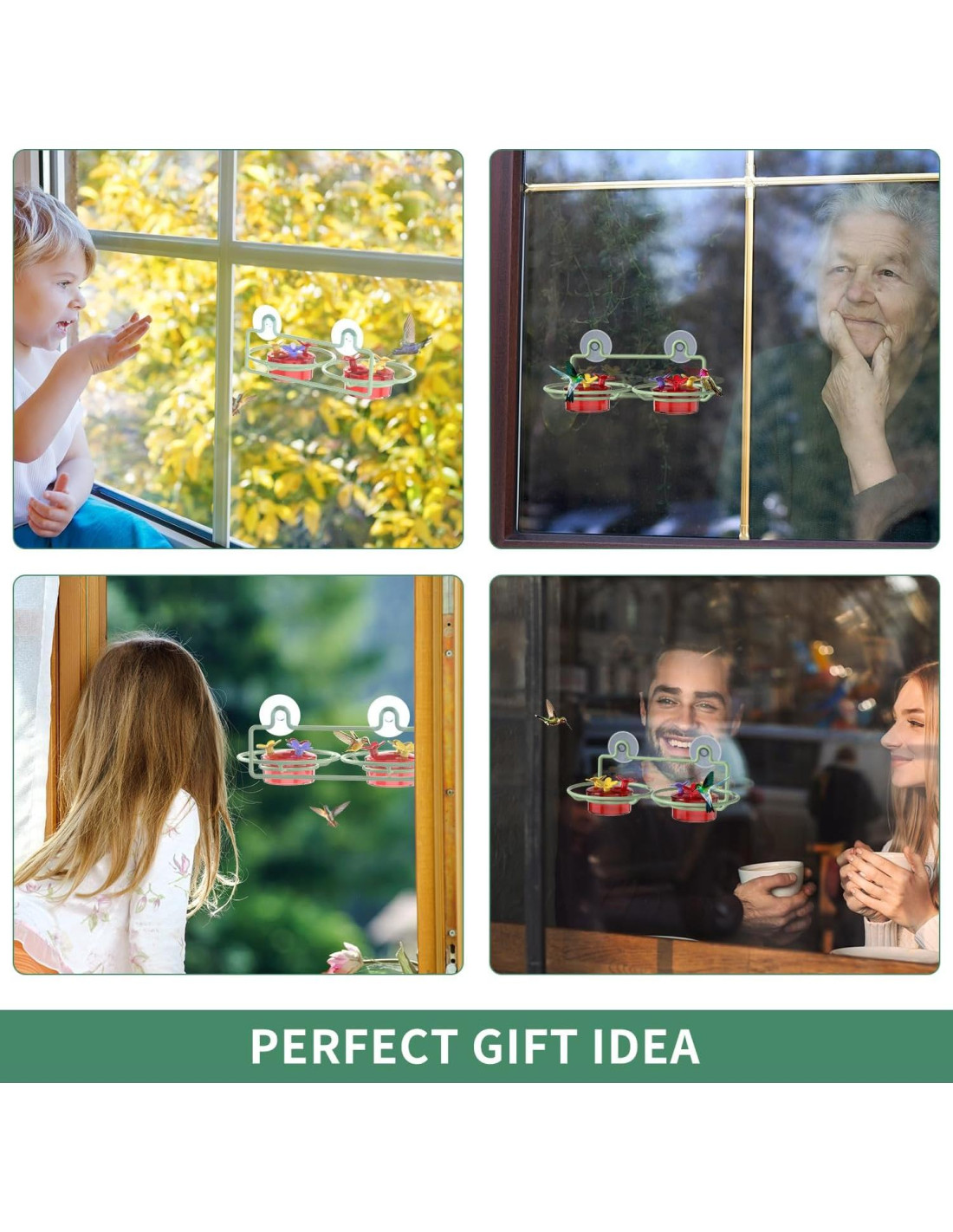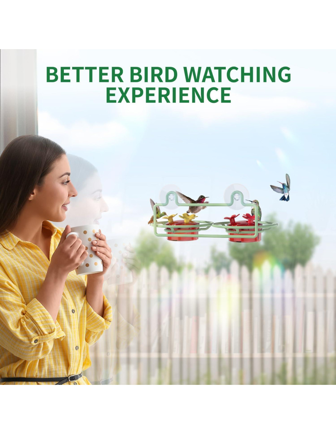 - Comedero Pequeño para Colibríes de Ventana: Nuestro comedero cuenta con una base de metal que se adhiere a su ventana con ventosas fuertes. La base sostiene dos contenedores, cada uno con una capacidad de 59 ml (2 onzas), y cada contenedor incluye tres puertos de alimentación a prueba de abejas. Los acentos de flores rojas y amarillas atraen a los colibríes a su ventana para una experiencia de alimentación cercana.