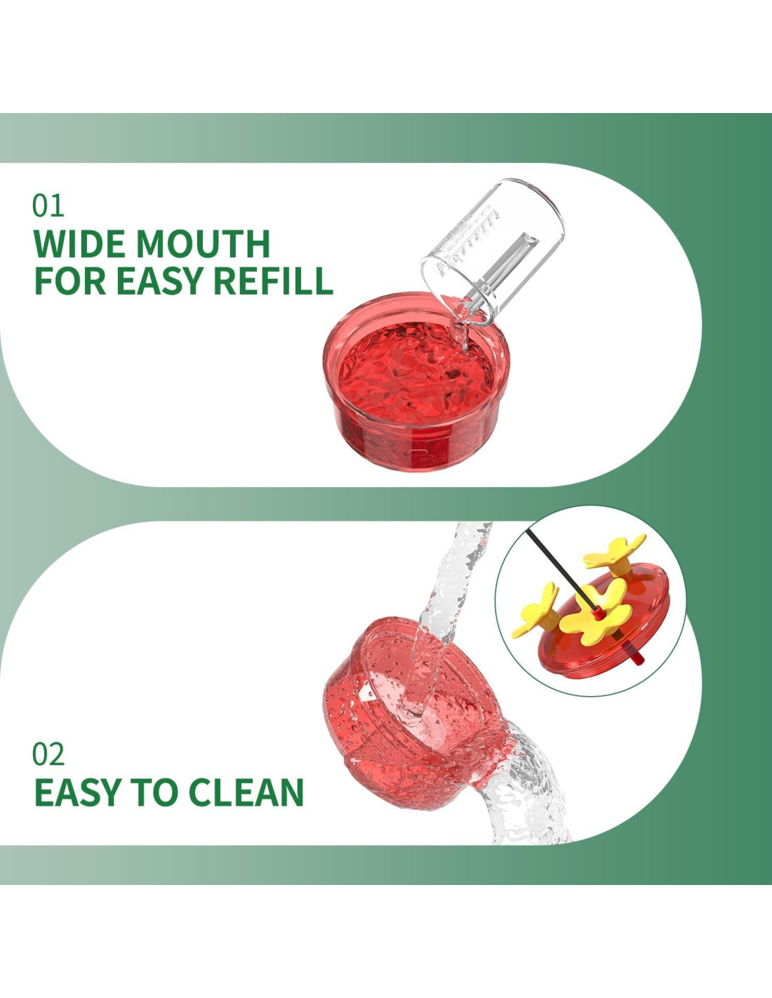 - Fácil de Limpiar y Rellenar: El comedero se desprende fácilmente de su base, y el diseño de boca ancha asegura un relleno y limpieza sin esfuerzo. Los contenedores transparentes le permiten monitorear los niveles de néctar y rellenar según sea necesario.