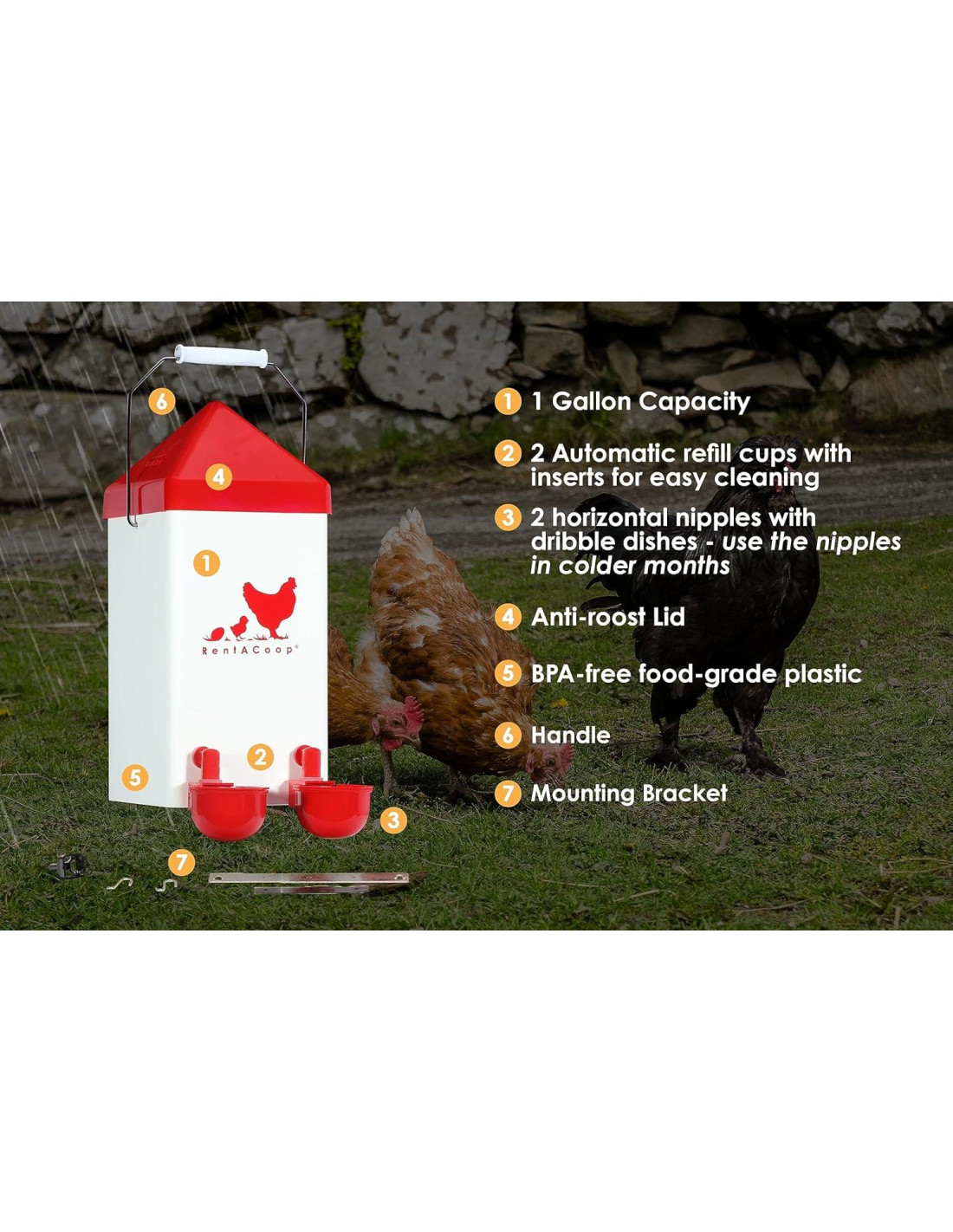 - Qué hay en la Caja: Un bebedero para pollos de plástico de grado alimenticio y libre de BPA de 1 galón (3.78 litros), asa, 1 tapa antiposadero, 2 picos horizontales con platos de goteo, 2 tazas de llenado automático y kit de montaje