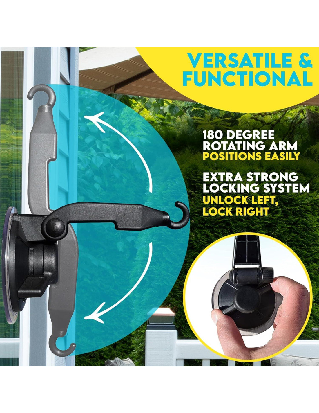 - FUNCIONAL: El gancho de ventosa montado en la ventana está hecho de plástico duro premium con un mecanismo de bloqueo seguro. Una ventosa de 7.1 cm de diámetro proporciona un agarre sustancial. El mecanismo de bloqueo por torsión asegura que haya suficiente presión para prevenir la entrada de aire y aflojar el agarre. Un brazo rotatorio de 180 grados permite varios ángulos posibles. Simplemente gira la rueda de mano del brazo para bloquearlo en su lugar. Se extiende un máximo de 11.4 cm a un ángulo de 90 grados alejado de la superficie de montaje.