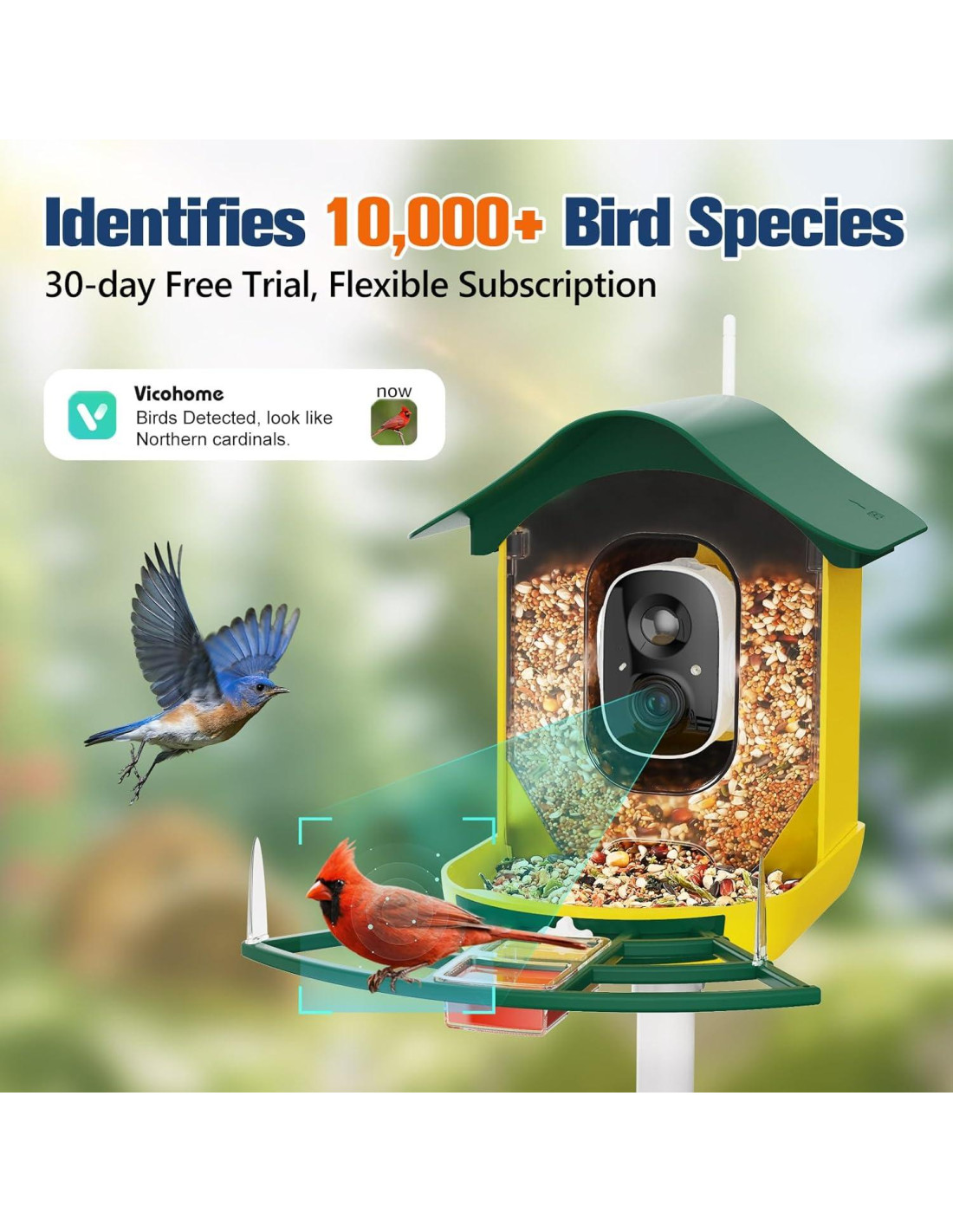 - [Reconocimiento AI y Almacenamiento de Fotos y Videos] Esta cámara para aves viene con almacenamiento en la nube gratuito de por vida (0.5GB bucle de 3 días) y soporta tarjeta TF de hasta 128GB (no incluida). El servicio de nube profesional es una prueba gratuita de 30 días y requiere suscripción, incluyendo almacenamiento de 3-10 GB, notificación inteligente, configuración de zona de actividad e identificación AI (más de 10000 especies). Proporciona una gran cantidad de conocimientos sobre colibríes para ti y tus hijos.