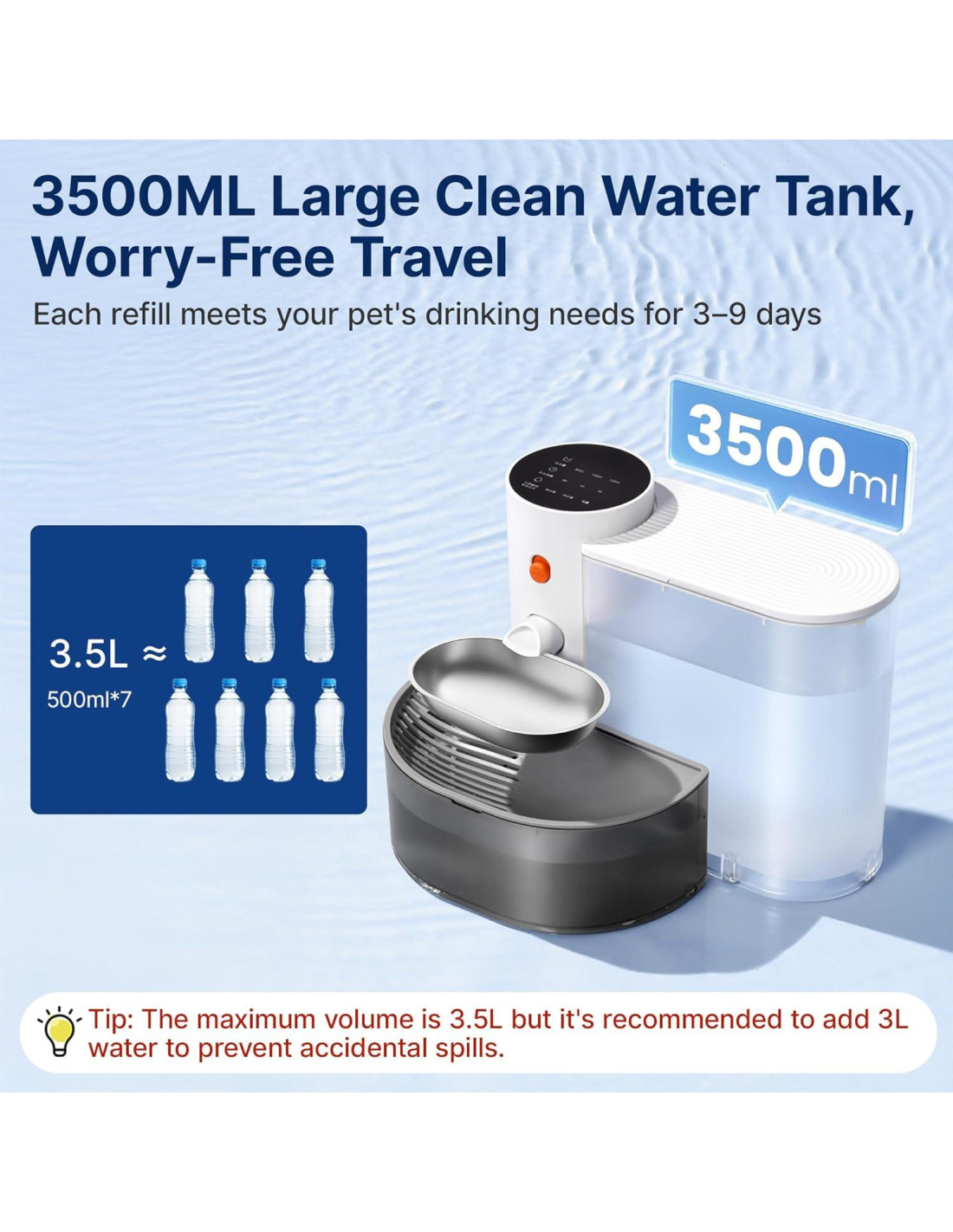 - Capacidad Máxima de 3500ML (3.5L) para Viajes Sin Preocupaciones - Este dispensador de agua inteligente cuenta con un gran tanque de agua limpia de 3500ML, satisfaciendo las necesidades de bebida de tu mascota durante 3-9 días. Ya sea que estés en casa o fuera, tus amigos peludos se mantendrán hidratados sin necesidad de recargas constantes. Recomendamos agregar solo 3L de agua para evitar derrames accidentales.
