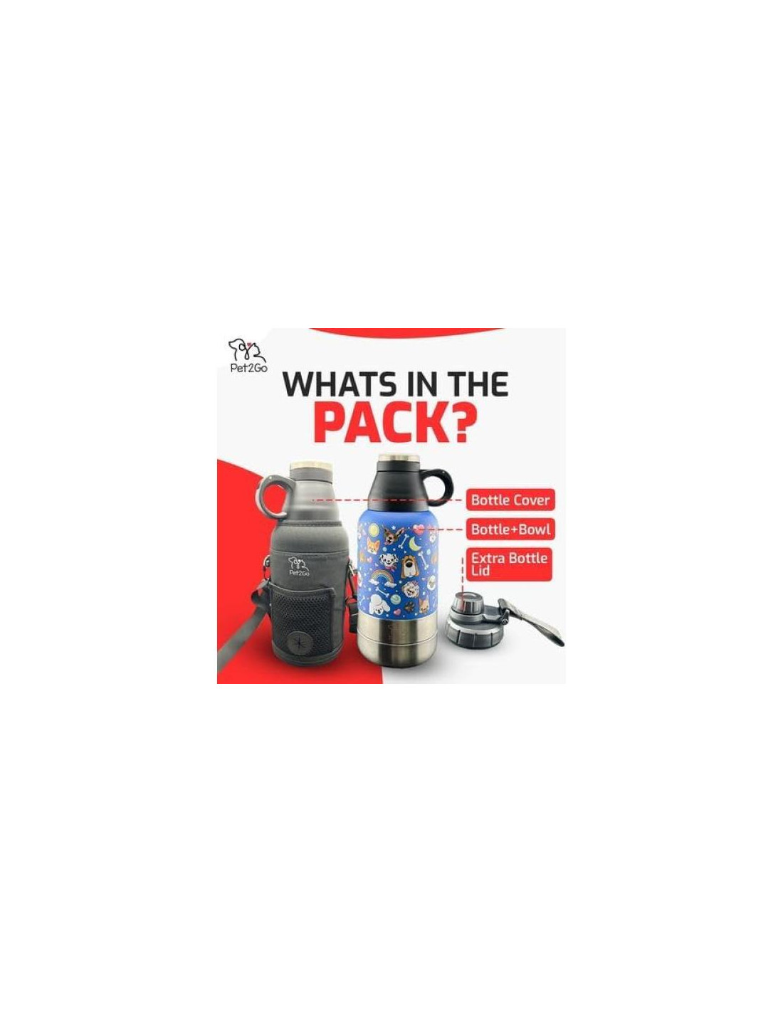 Esta botella de agua portátil para perros tiene un fondo innovador con 2 cuencos desmontables de acero inoxidable para comida y agua, convirtiéndola en un excelente compañero de viaje para tus paseos diarios, paseos en coche, caminatas, experiencias de camping y más! La botella de agua disfruta de un interior aislado con cero condensación que mantiene el líquido caliente hasta por 12 horas y frío hasta por 24 horas, asegurando una temperatura de servicio ideal para tu cachorro incluso durante esos excesivamente cálidos días de verano en la playa. Aquí en Pet2Go, entendemos que tu mascota es un valioso miembro de tu familia que merece el mejor cuidado disponible, manteniéndolos felices y saludables por mucho tiempo! Nuestra línea de productos está destinada al dueño de mascotas moderno y en movimiento que entiende que es su responsabilidad asegurar una hidratación óptima y un estómago lleno para su compañero, sin importar a dónde los lleve el día. Ofrecemos productos de cuidado para mascotas superiores fabricados de acuerdo con los más altos estándares internacionales de calidad, asegurando durabilidad y funcionalidad. - Hecho para durar con materiales de primera calidad; - Seguro para perros, de grado alimenticio y fácil de limpiar; - Diseño aislado; - Gran capacidad de 32oz; - Incluye todos los accesorios necesarios en un diseño conveniente; - Experiencia sin desorden con cero fugas o derrames, cero condensación; - Maravillosa idea de regalo para dueños de mascotas. La botella de agua para perros de viaje Pet2Go asegura una experiencia de viaje sin complicaciones junto a tu mascota, manteniendo su agua, golosinas y comida al alcance inmediato y previniendo todo tipo de experiencias desordenadas! El dispensador de agua portátil para perros incluye un práctico y fácil de llevar soporte para golosinas, además de una funda ergonómica de neopreno con correa de hombro ajustable y pequeño bolsillo frontal. ¡Una elección inteligente para sesiones de entrenamiento o viajes!